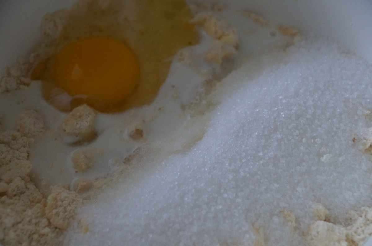 - Voeg 130 gram suiker, 1 ei maat L en 2 el melk toe