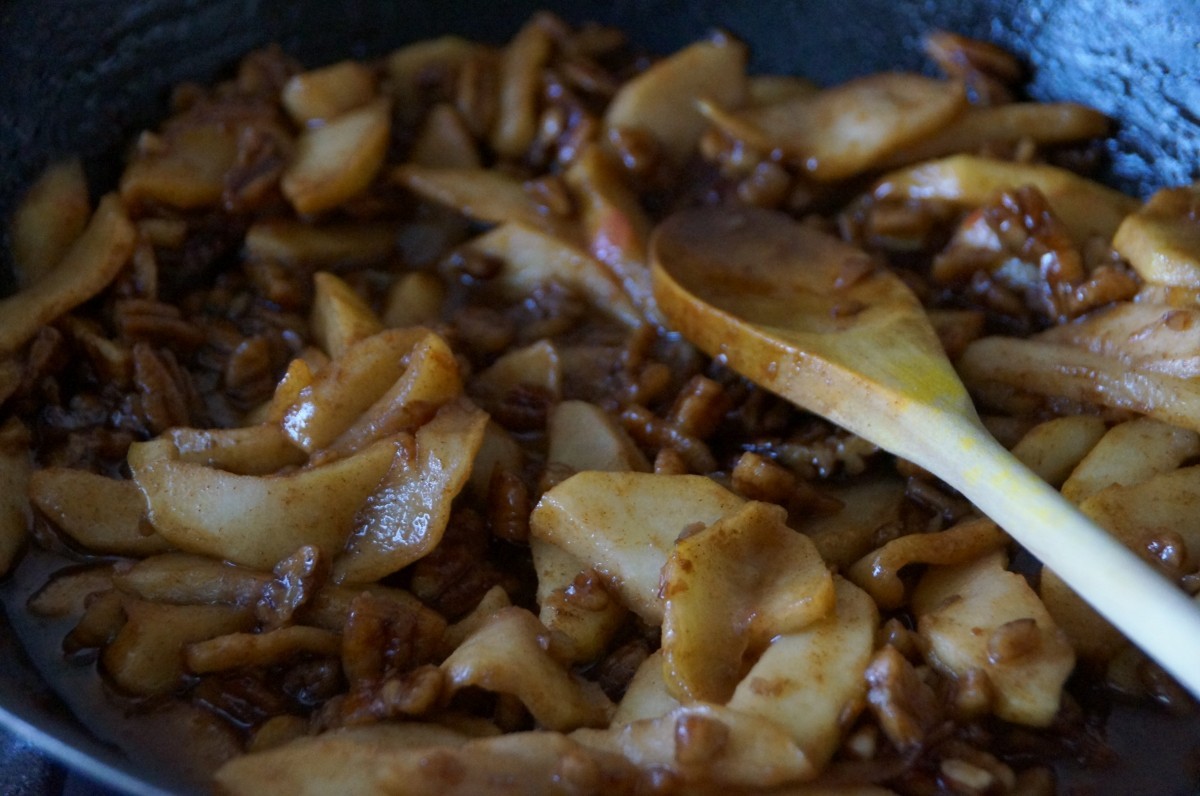 - Voeg 2 el honing, 2 el kaneel, Â 5 el bourbon en de grof gehakte pecannoten toe