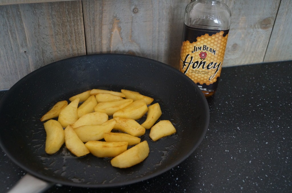 * Verwarm een koekenpan met een flinke theelepel roomboter en bak hier de appelschijfjes met een flinke scheut whiskey Jim Beam Honey(laat de appels niet door en door gaar worden, ze moeten nog een beetje bite hebben)
