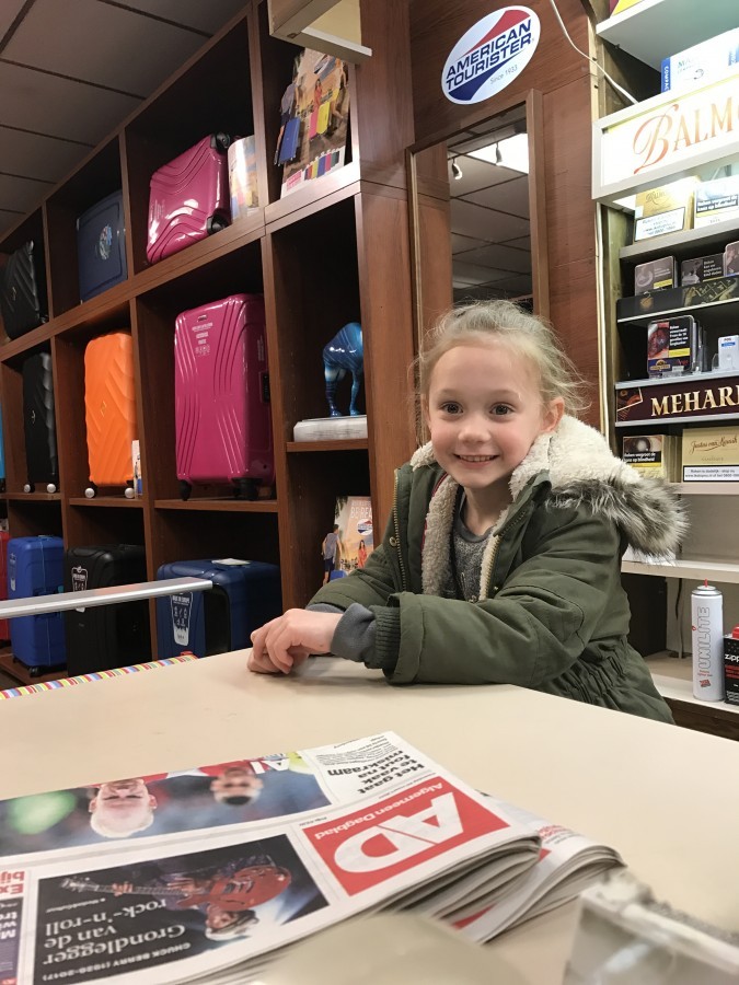 Amaranthe aan het helpen bij opa en oma in de winkel. Het verkopen zit er al van jongs af aan in. Echt een kind van haar vader en moeder 🙂