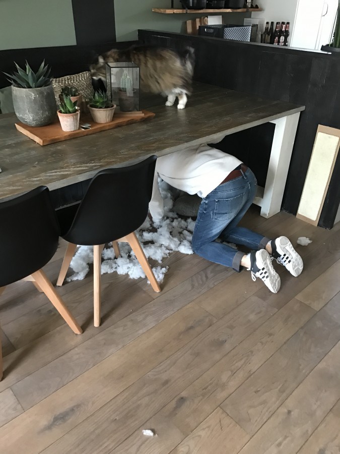 AHHHHHHH leuk hoor zo’n hond. Dankzij Boyd houden we geen kussens meer oven!!! Dus op de knietjes maar om alles weer op te ruimen.