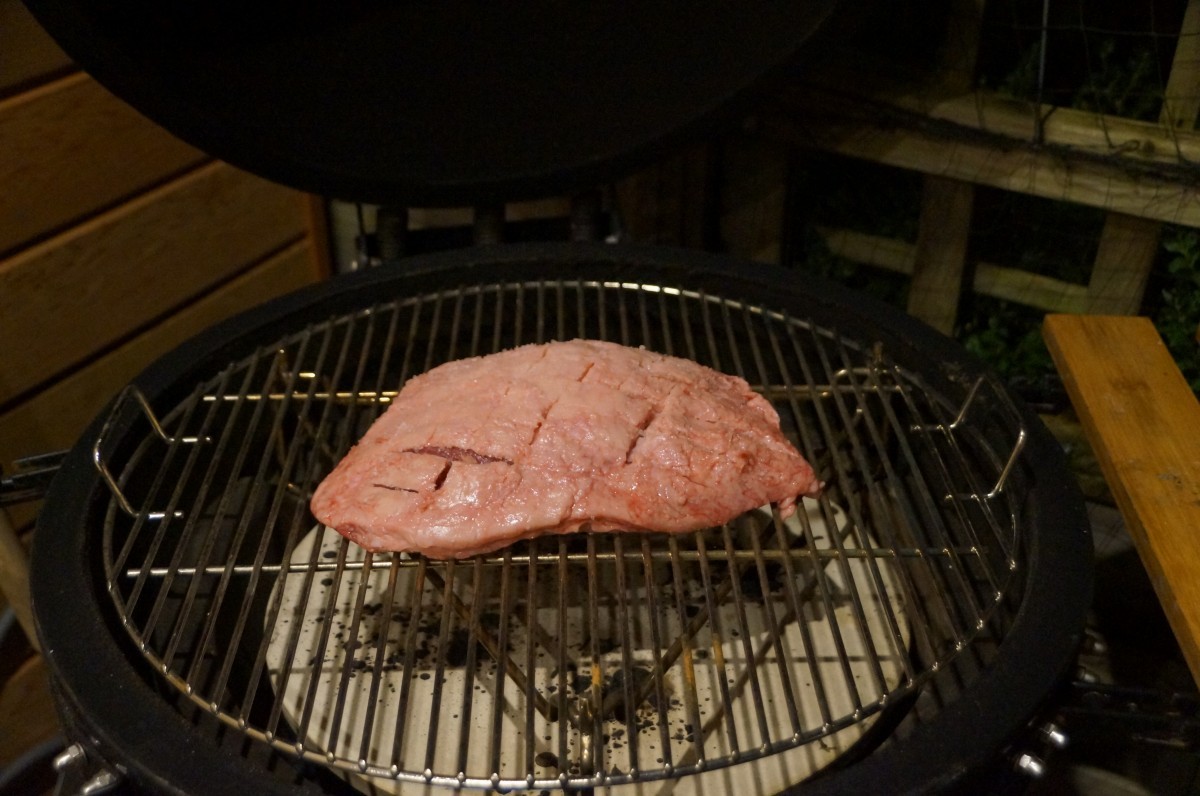 - Het vlees gaat nu op de bbq. Controleer goed of de bbq echt de 100 graden heeft. Meten is weten! Het mag iets hoger zijn want zodra je de deksel open doet ben je al wat warmte kwijt. Let er alleen op dat het niet veel hoger is want dan gaart je vlees te snel en wordt het taai