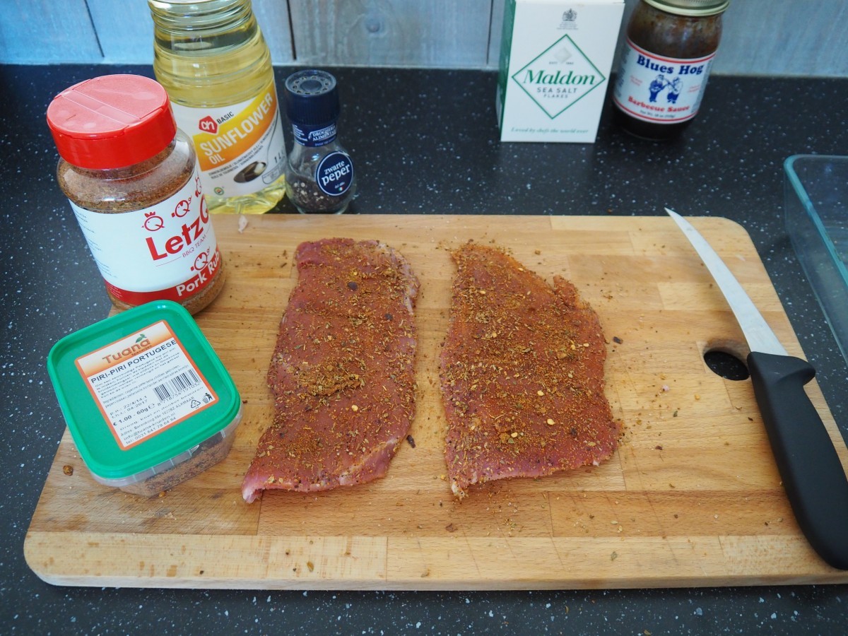 - Leg de vinkenlappen op een plank en smeer ze in met pork rub. Ik gebruik de pork rub van LeztQ omdat deze echt de lekkerste is die ik tot nu toe heb geprobeerd. Aangezien je Rub een heel belangrijke bijdrage levert aan de smaak van het vlees, is het belangrijk dat je niet op je Rub bezuinigd.