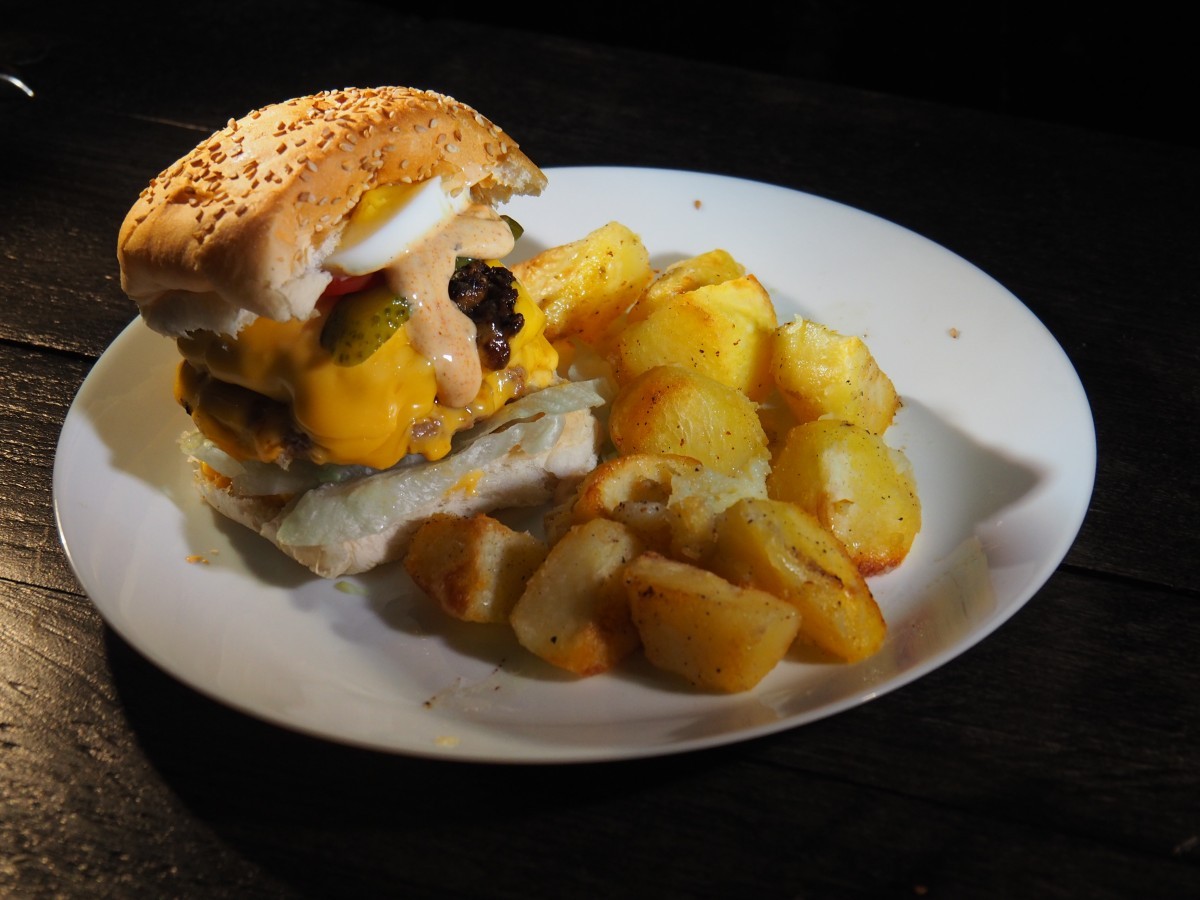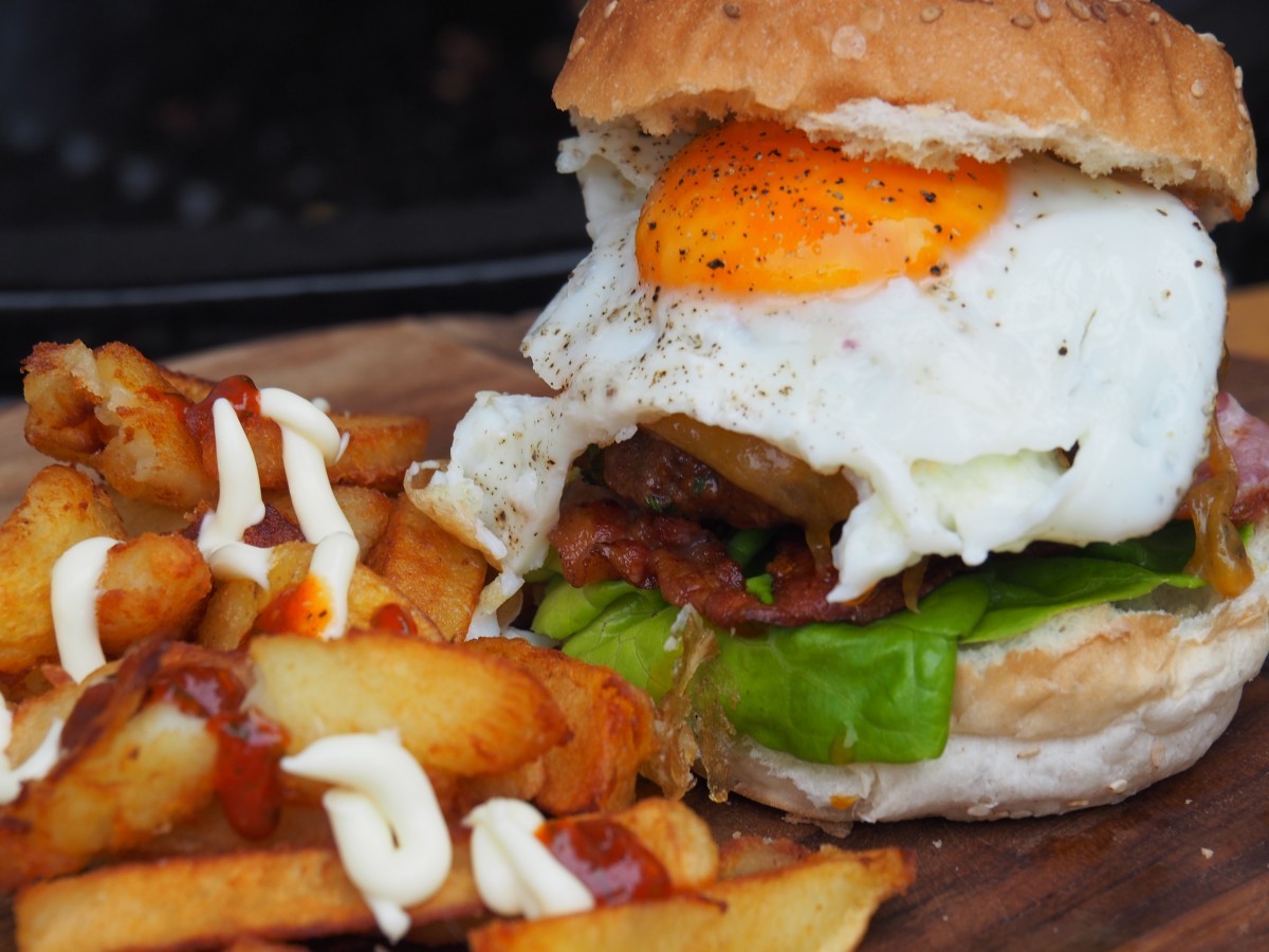 feb02 BBQEten en DrinkenRecepten B4men Cheese Burger met gekarameliseerde pittige ui en gebakken ei Jan Willem Huffmeijer