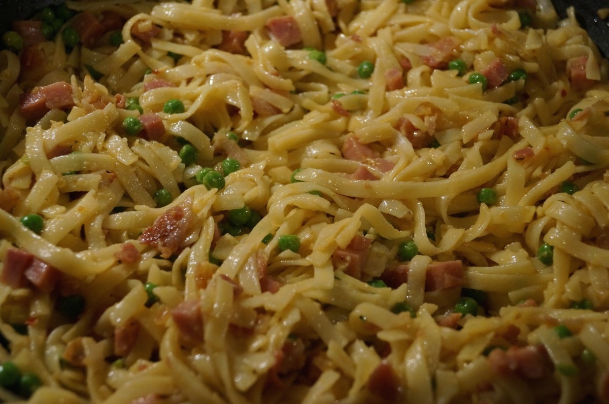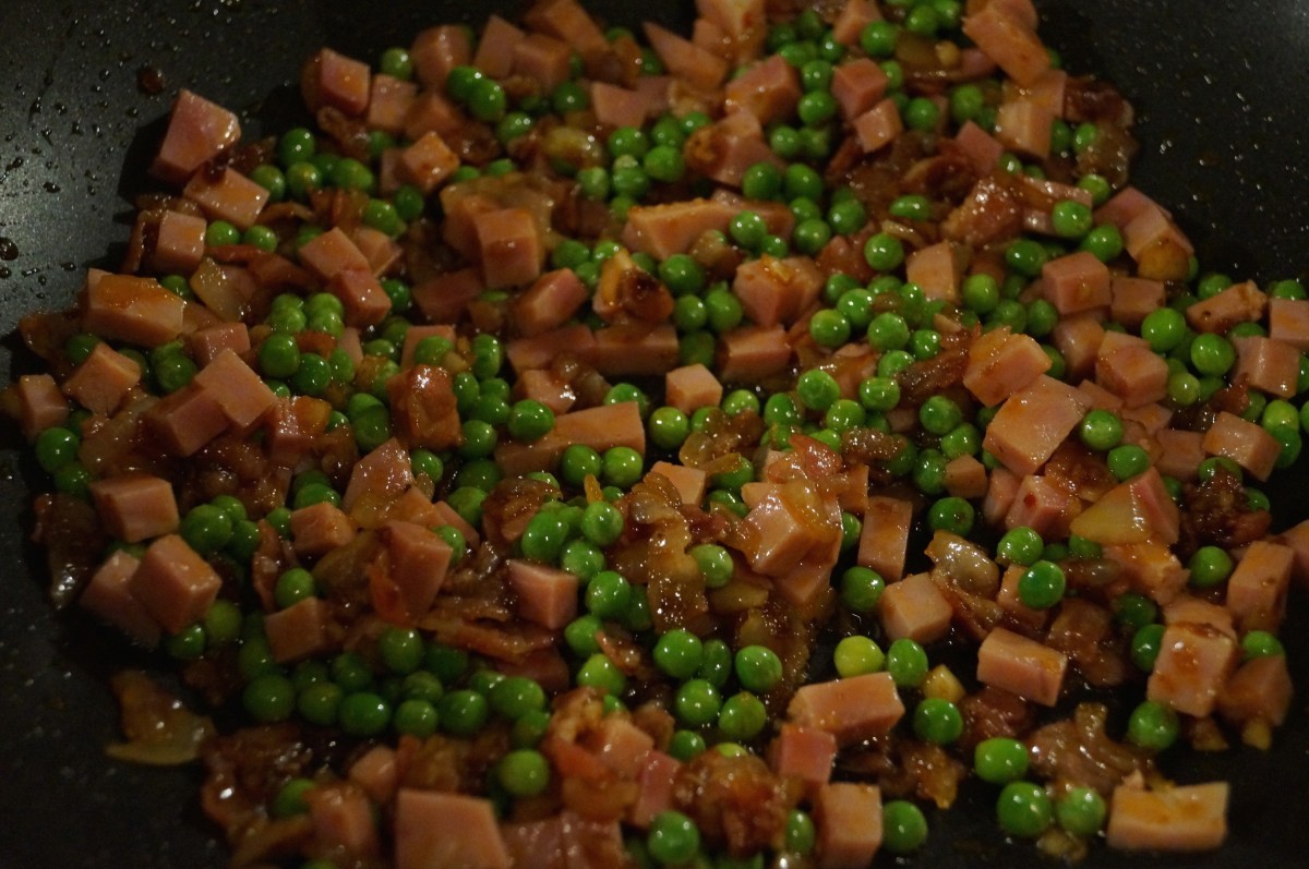 3. Voeg de hamblokjes samen met de erwtjes toe en bak tevens weer kort mee