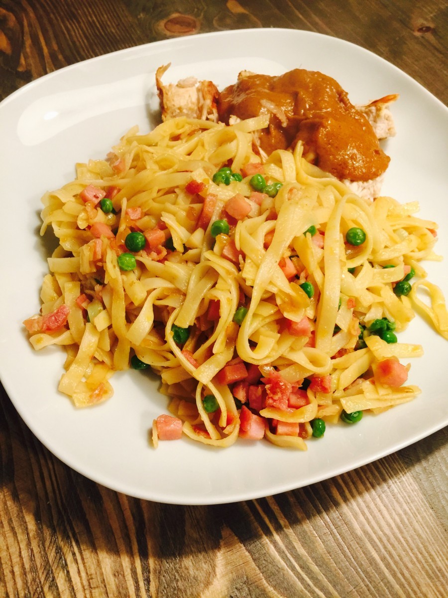 Chinese bami, wat is nu Chinese bami??? Bij iedere Chinees is de “Chinese bami” anders. Soms krijg je dunne bami, dan lijkt het meer op een soort noodles en soms krijg je dikkere bami, een soort tagliatelle met een gepocheerd ei en een groot stuk kleffe ham. Marie Louise vindt die kleffe bami op zijn tijd ontzettend lekker maar aangezien wij het liefst zelf koken is zij de keuken ingedoken om het zelf te gaan maken en ik moet zeggen, het was heerlijk. En dat uit mijn mond, dat zegt wel wat, ik vind die kleffe dikke bami namelijk helemaal niet lekker van de Chinees. Dit is zeker een blijvertje. De eerste keer hebben wij het zonder iets erbij gegeten en dat was al lekker, maar met zelfgemaakte satésaus en gemarineerde saté stokjes is het helemaal een feestmaal. Wil je meer lekkere recepten klaarmaken, kijk dan ook eens op onze foodblog Familie over de Kook.