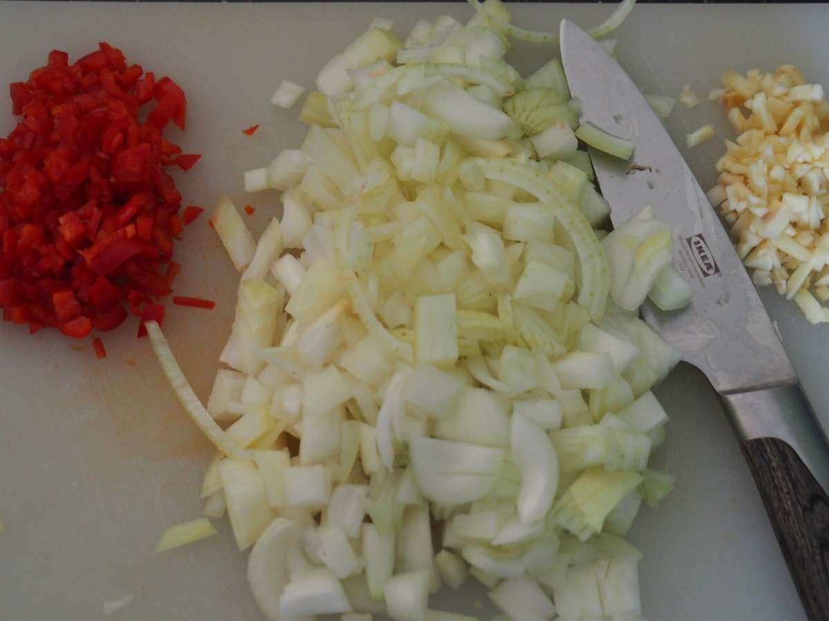 - Doe olie in de pan en zodra deze warm is bak je de uien, knoflook en peper aan voor 5 min