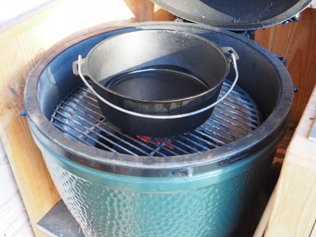 - Steek de BBQ aan en zet hier een pan op met een dikke bodem. (LET OP niet iedere pan is hier geschikt voor)