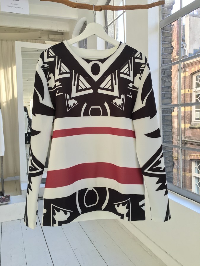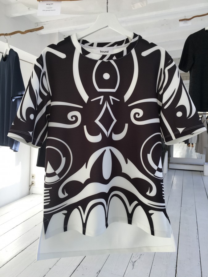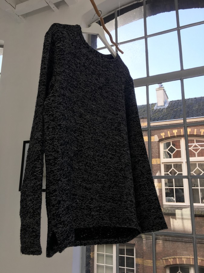 We werden ontvangen door de twee sympathieke gezichten achter het merk. Maras Rejaän (ontwerper) en Sheila Lopes Afonso (zakelijk brein) hebben met Bound Amsterdam echt iets bijzonders neergezet. De collectie springt er niet uit met kleuren en bijzondere ontwerpen die door bijna niemand gedragen zullen worden, Bound Amsterdam blinkt uit in de keuze voor mooie materialen en de beste kwalitatief mogelijk manier van produceren. Bijzonder aan de kleding is ook het feit dat het heel erg unisex is. Unisex is erg lastig, toch is het Bound Amsterdam bijzonder goed gelukt om kleding te maken die mij maar ook Marie Louise aansprak. De kleuren zijn rustig en de stoffen rijk, bij een aantal stukken is er gekozen voor een bijzondere print. Deze print is geïnspireerd op de tattoo kunst uit Indonesië, hier komt Maras vandaan en zijn afkomst is dus op een subtiele manier in de collectie verwerkt.
