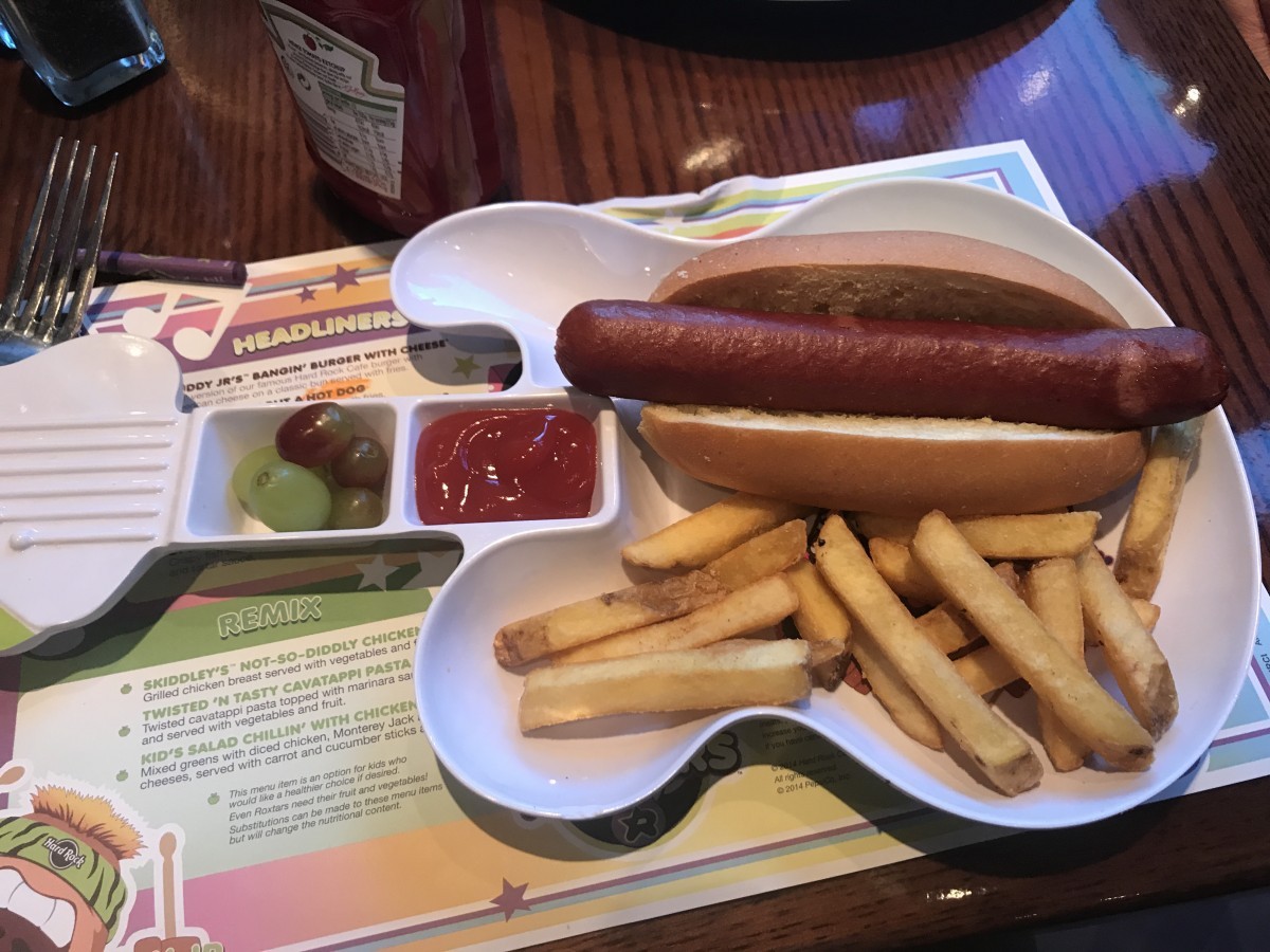 Zoals aangegeven zijn wij dit keer niet met zijn tweeën gaan eten bij het Hard Rock Cafe maar met onze kids. Wij waren erg benieuwd of dit wel leuk zou zijn voor de kinderen en wij kunnen nu wel zeggen dat het echt onwijs leuk is voor de kinderen. Dit hadden we eerlijk is eerlijk echt niet verwacht. De bediening was super leuk voor hun en maakte veel grapjes. Er wordt ook echt gedacht aan de kinderen. Zo krijgen ze netjes een kleurplaat met kleurpotloden en ook is er een speciaal kindermenu. Amaranthe en Beaudine gingen allebei voor de HotDog met friet. Beaudine had alleen al snel spijt toen ze onze burgers zag. Zij is echt een burger fanaat en besloot direct om de volgende keer ook een burger te nemen. Gelukkig vonden ze de HotDog wel lekker en ook de manier van serveren was erg tof gedaan. Het kindermenu werd namelijk uitgeserveerd op een bord in de vorm van een gitaar. Vooral Amaranthe (onze jongste) was hier erg van onder de indruk.