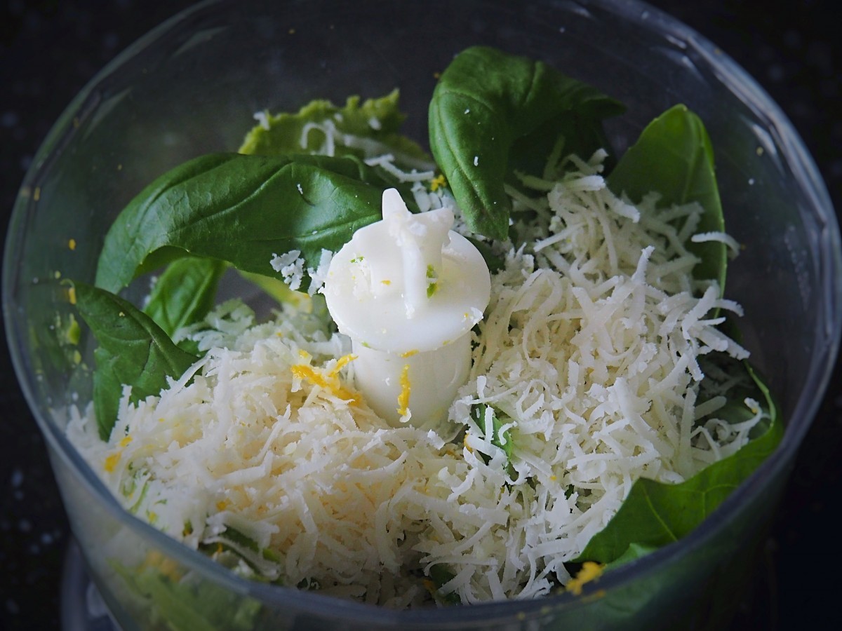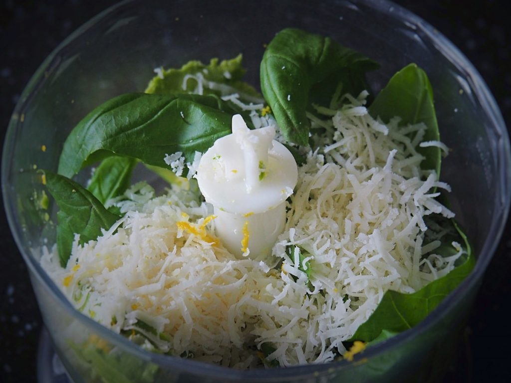 • Voeg de knoflook, citroensap, citroenrasp, basilicum, geraspte Parmezaanse kaas en een scheut extra vierge olijfolie toe