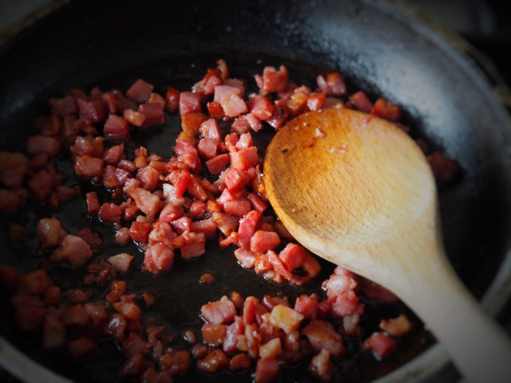 • Bak de spekjes krokant en laat eventueel uitdruipen op keukenpapier (wij vinden het vet juist lekker, maar daardoor natuurlijk niet heel gezond)