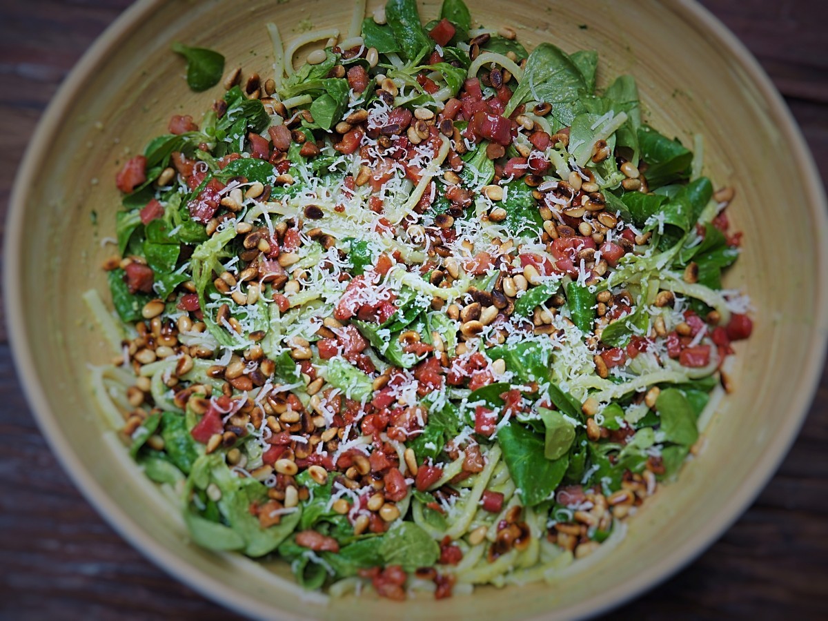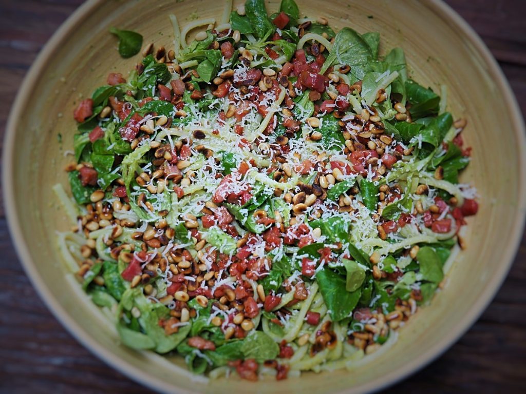 • Bestrooi met de pijnboompitten, uitgebakken spek, Parmezaanse kaas en een scheutje extra vierge olijfolie.
