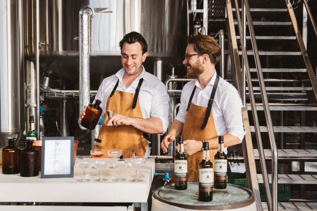 Als je een leuk en goed introductiefeest wil hebben zit je bij Pr-bureau Glasnost heel goed. Zij hadden de opdracht om het feestje voor de nieuwe Jameson Caskmates te organiseren. De locatie die zij hadden bedacht was de brouwerij Two Chefs Brewing in Amsterdam. Opgericht in 2012 door de vrienden en “keukenbrouwers” Sanne en Martijn. Zij brouwen heel succesvol een aantal prachtige biertjes met namen als: Green Bullet, Howling Wolf, Holy Gunter, Funky Falcon. Je snapt hieraan wel dat die twee heel veel lol hebben in hun werk. En hun bieren smaken heerlijk. Ook bedachten de dames van Glasnost dat het weleens leuk zou zijn om de Jameson Caskmates te vergezellen met iets verfijnder eten dan burgers of spareribs van de barbecue. Dus werd het een krokant horentje met foie gras, Coquilles St-Jacques met een mousse van pastinaak en nog meer heerlijkheden die uitstekend blijken te passen bij deze whiskey. Kortom de heerlijke Jameson Caskmates ging met mooie en delicate maatjes de kelen van de genodigden door.