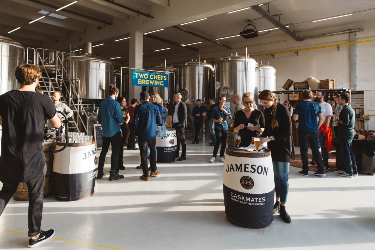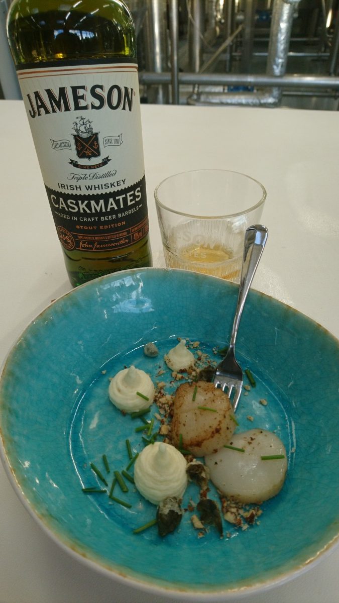 Als je een leuk en goed introductiefeest wil hebben zit je bij Pr-bureau Glasnost heel goed. Zij hadden de opdracht om het feestje voor de nieuwe Jameson Caskmates te organiseren. De locatie die zij hadden bedacht was de brouwerij Two Chefs Brewing in Amsterdam. Opgericht in 2012 door de vrienden en “keukenbrouwers” Sanne en Martijn. Zij brouwen heel succesvol een aantal prachtige biertjes met namen als: Green Bullet, Howling Wolf, Holy Gunter, Funky Falcon. Je snapt hieraan wel dat die twee heel veel lol hebben in hun werk. En hun bieren smaken heerlijk. Ook bedachten de dames van Glasnost dat het weleens leuk zou zijn om de Jameson Caskmates te vergezellen met iets verfijnder eten dan burgers of spareribs van de barbecue. Dus werd het een krokant horentje met foie gras, Coquilles St-Jacques met een mousse van pastinaak en nog meer heerlijkheden die uitstekend blijken te passen bij deze whiskey. Kortom de heerlijke Jameson Caskmates ging met mooie en delicate maatjes de kelen van de genodigden door.