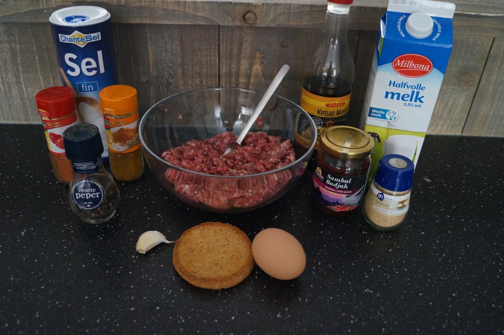 – Meng het gehakt met het geklutst ei, scheutje melk, scheutje ketjap en het beschuit.