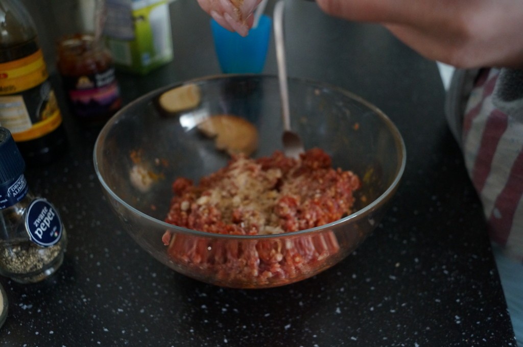 – Voeg dan de sambal, geperste knoflook en alle kruiden toe en meng dit goed door met je handen.