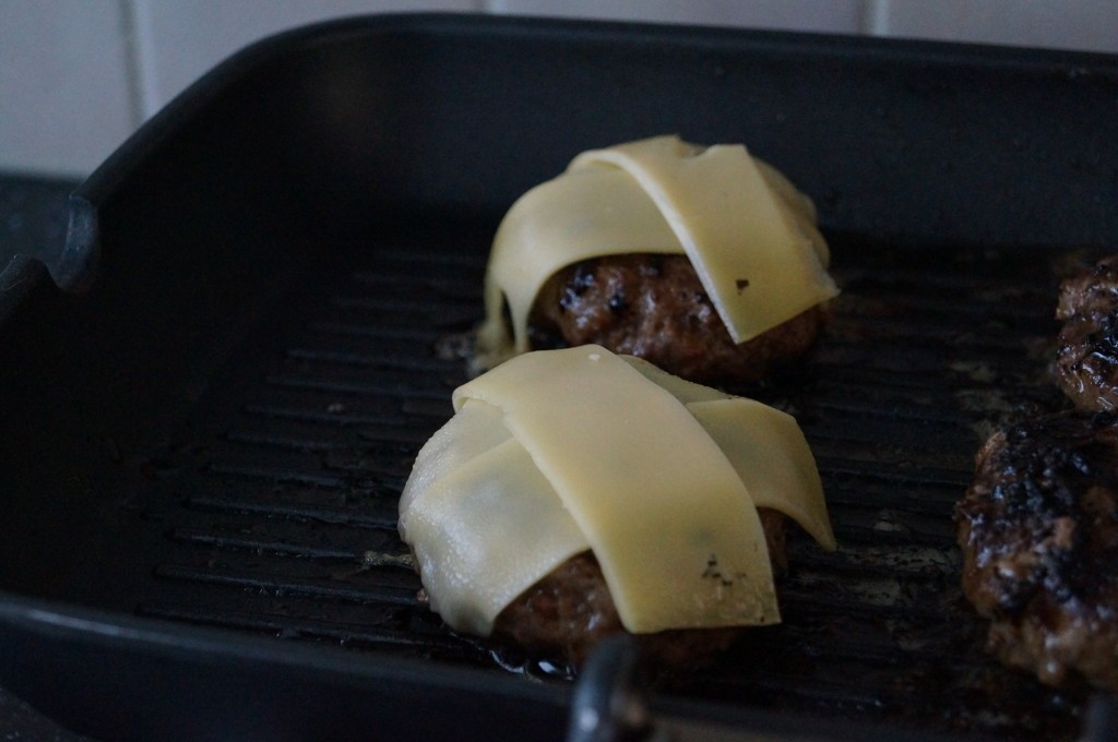 – Als je hamburgers bijna klaar zijn, leg er dan wat plakjes kaas op(ik heb extra belegen gebruikt, maar je kan ook cheddar kaas gebruiken)