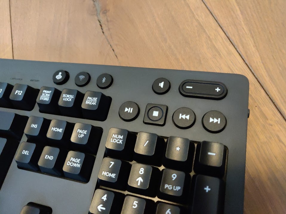 Zoals ik al eerder zei, schreeuwt de Logitech G613 niet meteen gamer. Dit vind ik persoonlijk ook geen probleem. Want dan zou je hem ook op kantoor kunnen gebruiken bij wijze van. Nu heb je wel al je multimedia knoppen om bijvoorbeeld je geluid zachter te zetten, liedjes te pauzeren of naar een nieuw nummer te gaan. Verder zitten er boven nog drie extra knoppen erbij om de game modus aan te zetten, draadloos in te schakelen of via bluetooth te verbinden. Aan de linker kant bevinden zich de G-toetsen. deze kan je met een aparte functie instellen voor in je games. Of wil je misschien wel applicaties ermee starten, ze zijn echt heel erg goed in te stellen.