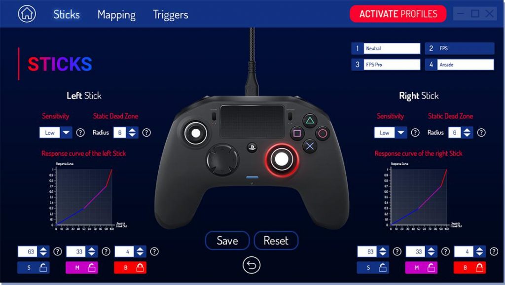 De instellingen die kan je doen in de controller maken toch wel echt het verschil, zo kan je de Deadzones van je thumbsticks aanpassen. Als je een klein tikje eraan geeft kan je, in de extreemste gevallen, heel veel draai geven of juist heel weinig. Deze optie heb je ook voor de L1 en R1 knop. Je kan bijvoorbeeld instellen als je de toets voor 60% in drukt, het mechanisme al gaat werken. Voor de mensen die echt hun handen niet meer willen verplaatsen, heeft de controller ook 4 knoppen op de achterkant die je zelf kan aanpassen op de computer wat ze gaan doen. Je kan als je wilt 4x de ‘X’ op de achterkant doen als je zou willen. En kan je nu de D-pad in 8 richtingen activeren in plaats van de standaard 4.