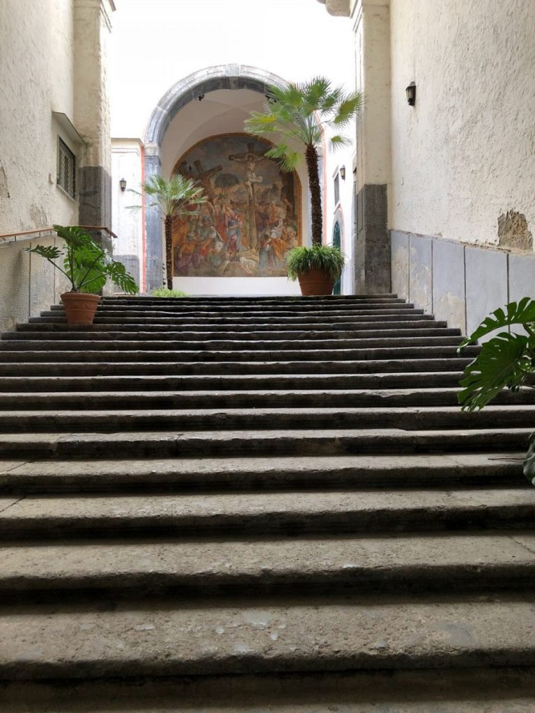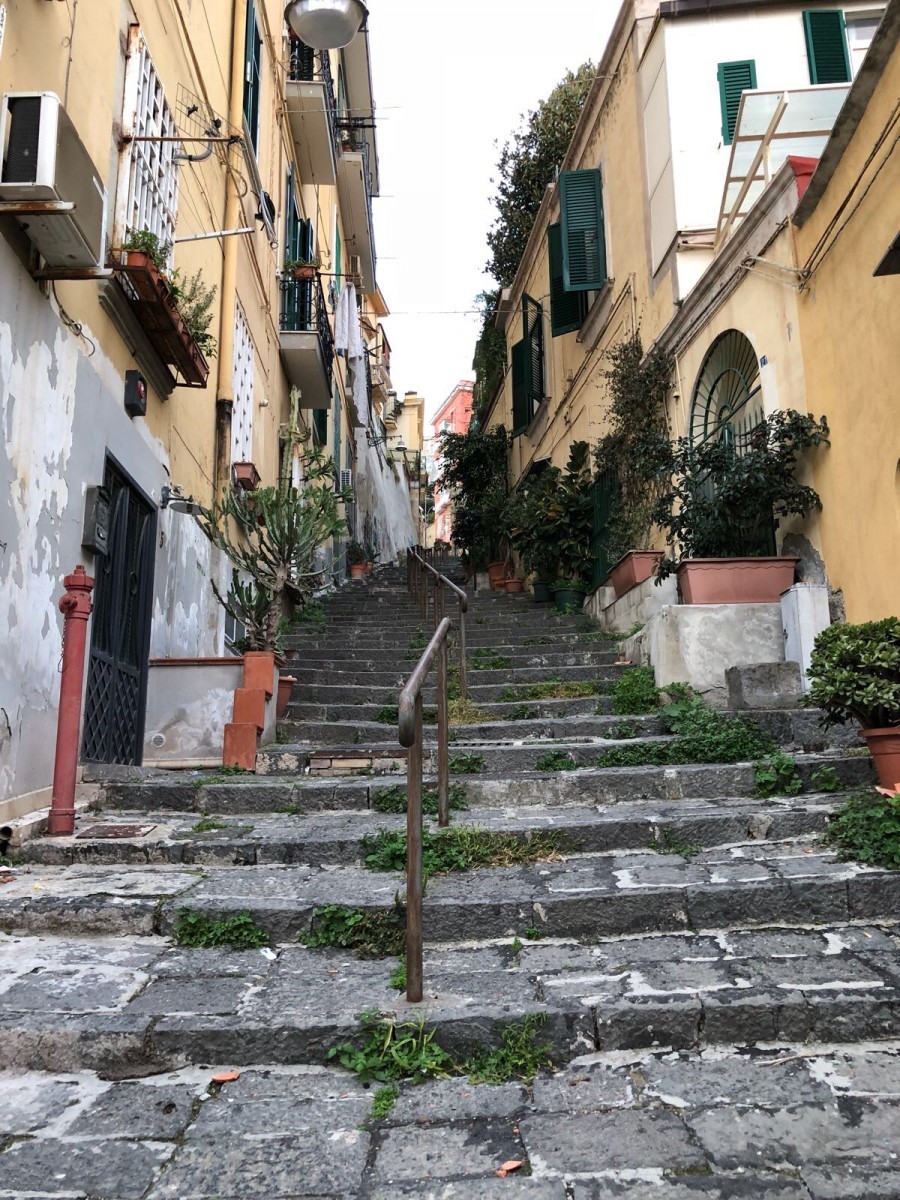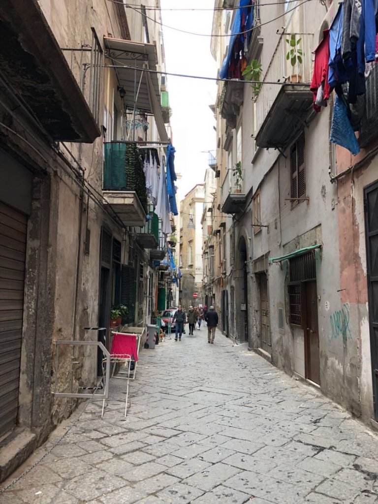 Terug naar onze reis. Napels is geweldig als je door heel veel dingen heen kan kijken. Wanneer je de geschiedenis van Napels een beetje weet vallen heel veel puzzelstukjes op z’n plaats. Napels is arm en heeft een verleden, een heden en een toekomst met de Gomorra. Dit zie je terug in het dagelijks leven als je weet waar je op moet letten. Dit maakt Napels voor ons heel boeiend. De grote verborgen binnenplaatsen en de nauwe steegjes maken het voor iedereen die kwaad in de zin heeft de perfecte stad. Toch hebben wij ons geen moment onveilig gevoeld of hebben wij problemen gehad. Wij konden ons niet helemaal aan het advies houden om in het “veilige” en toeristisch gedeelte te blijven. Wij willen graag een stad zien zoals hij echt is. Struinend door straatjes en steegjes zie je veel meer! Je merkt het snel genoeg wanneer je niet gewenst bent. Zo wilde wij een steeg inlopen om hier een foto te maken, dit bleek niet helemaal de bedoeling. Een dikke vol getatoeëerde Napolitaan op een scooter kwam op ons af. Ik dacht nog heel naïef dat hij de bocht om moest en maakte netjes ruimte, hij drukte zijn remmen in en keek ons indringend aan. Toch wilde wij de foto maken…. ik liep rustig een paar meter de steeg in, Marie Louise maakte de foto maar werd volledig gescand door hem. Het leek ons toch beter een steegje verder te pakken…het moment was bijzonder, later besefte wij eigenlijk pas dat dit best raar was.