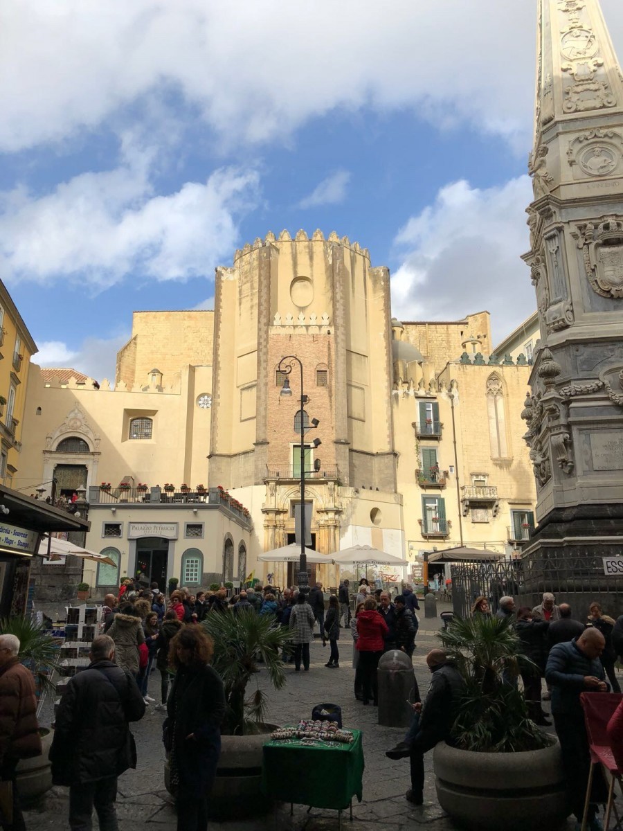 Op naar Napels. De vlucht met EasyJet ging zeer voorspoedig. Yes heerlijk!! Eindelijk weer even wat warmte opvangen. Het weer was het hele weekend super. De eerste twee dagen was de temperatuur hoog maar wel wat bewolkt en de laatste dag was koud (voor daar namelijk 9 a 10 graden) maar wel super zonnig. Daar sta je dan op de stoep van het vliegveld van een stad waar je nog niets van weet. Onze voorpret zat in het speuren naar onze bestemming, iets wat lekker gelukt is LOL!! Dus wij moeten even snel schakelen over hoe wij het gaan aanpakken. Eerst naar het hotel maar hoe? Ons hotel bleek te ver om te lopen, dus kozen wij voor de bus. Leuk dat je dan al gelijk wat van de stad kan zien. Daarna met de metro lijn 1 werd ons verteld, ook dit is gelukt. Bleek niet helemaal de veiligste route geweest te zijn maar wij hebben het hotel zonder kleerscheuren gehaald. Nu was het hotel vinden al een opgave op zich, drie keer de ingang voorbij gelopen. Bij de derde poging viel ons een klein bordje op bij een hele grote houten deur. Het bleek de bel, “pronto” zei een dame, in mijn beste Italiaans wist ik nog net pronto terug te roepen maar ze had gelijk door dat ik geen Italiaan was. Er ging in de hele grote deur een heel klein deurtje open whahaha Italianen zijn nu eenmaal niet groot. Verscholen achter deze deur bleek een binnenplaats met hierachter de ingangen naar verschillende adressen. Het hotel bevond zich op de twee verdieping. Wij werden heel vriendelijk ontvangen en kregen een uitleg over de stad. Wij moesten weer aan haar uitleggen dat wij geen idee hadden dat wij bij haar zouden gaan slapen….na veel vragen begon zij het concept te snappen en verklaarde ons nog net niet voor gek. Onze kamer bleek de grootste en meest luxe te zijn die ze hadden. De kamer was perfect!! Ruim en schoon met een prima badkamer. Maar het allermooiste was ons balkon! Wanneer wij de deuren opende stonden wij boven de Kalverstraat van Napels. Voor ons een pleintje zoals ze die alleen in Italië kennen en onder ons de winkelstraat. Vanaf het eerst ogenblik in Napels was de drukte van de stad als een deken over ons heen gekomen. Het balkon gaf ons de mogelijkheid om ons een soort van terug te trekken zonder iets van de drukte te missen. Ik heb de eerste 1,5 uur op het balkon gestaan en mij enorm verbaast over het leven van de Napolitaan.