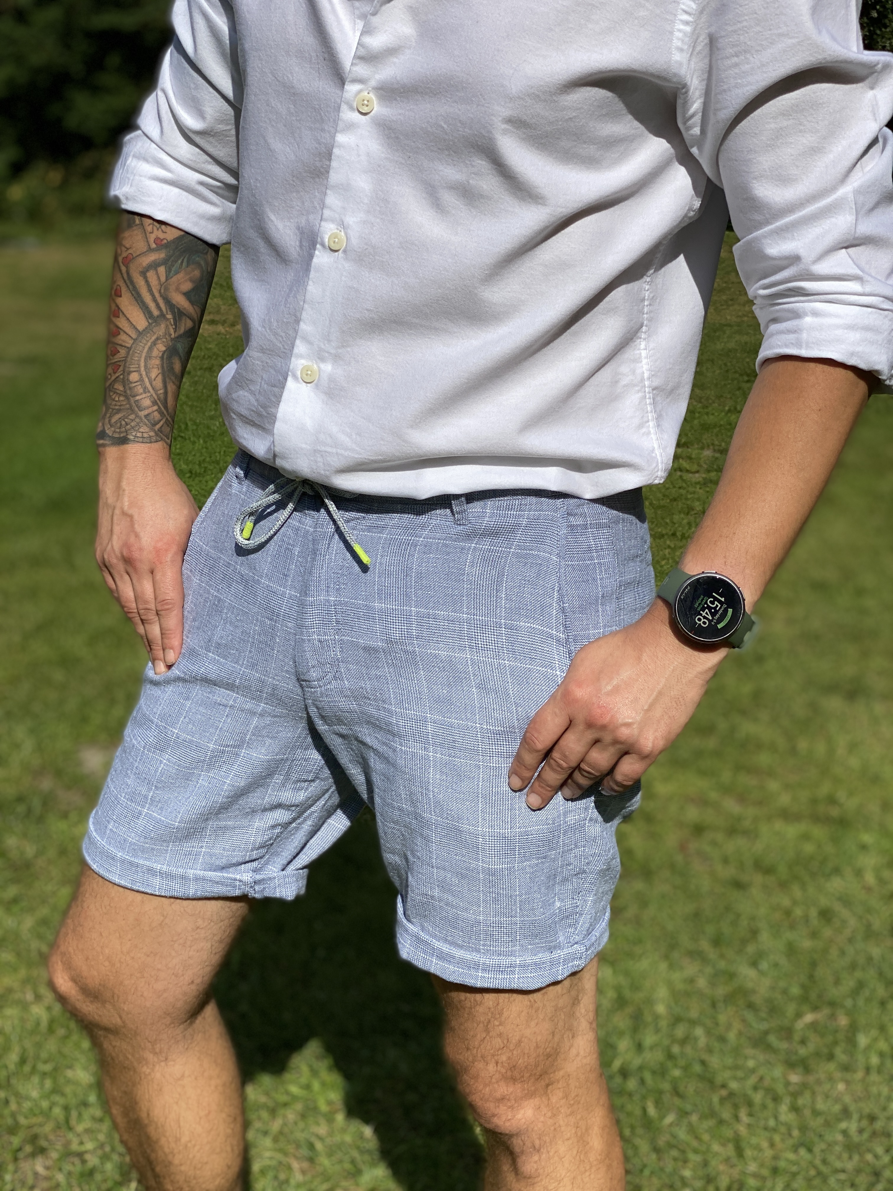 Lichtblauwe short: Heren Suitable Short Stanley. Deze short is de ultieme mix van casual en zakelijk. De short is heel goed zakelijk te dragen met een tof overhemd, zoals ik het witte overhemd op de short draag. Ideaal voor de warmere dagen in de nazomer. Wanneer je het short casual wilt dragen, is een tof shirt en het één keer omslaan van de pijpjes voldoende. Een heerlijk tijdloze broek voor de nazomer mode voor mannen.
