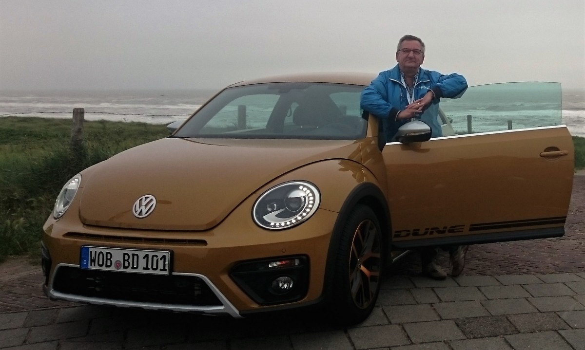 En nu na het begin van de Kever zo’n 77 jaar geleden komt Volkswagen met de nieuwe Beetle Dune op de markt. De geheel gerestylede Beetle werd op 2 juni j.l. op de boulevard van Noordwijk aan de pers gepresenteerd. Voor de gein waren er ook wat Classics van bijzondere uitvoeringen van de Kever. O.a. een cross-Kever en een paar buggy’s. Door het slechte weer die dag konden wij met deze auto’s helaas niet het strand op, maar op de weg kwam het Spartaanse “comfort” ook uitstekend tot zijn recht. Maar het ging natuurlijk over de nieuwe Beetle Dune. Het eerste wat opvalt is zijn stoere uiterlijk. Hij is wat langer geworden en ziet er robuust uit door de verhoogde carrosserie en de 18 inch lichtmetalen velgen. Op het achterwerk staat een spoiler waardoor er even “Porsche” door mijn hoofd ging. Maar al heeft hij een prachtige eigen androgene stijl en karakter hij blijft ook nog steeds FUN uitstralen.
