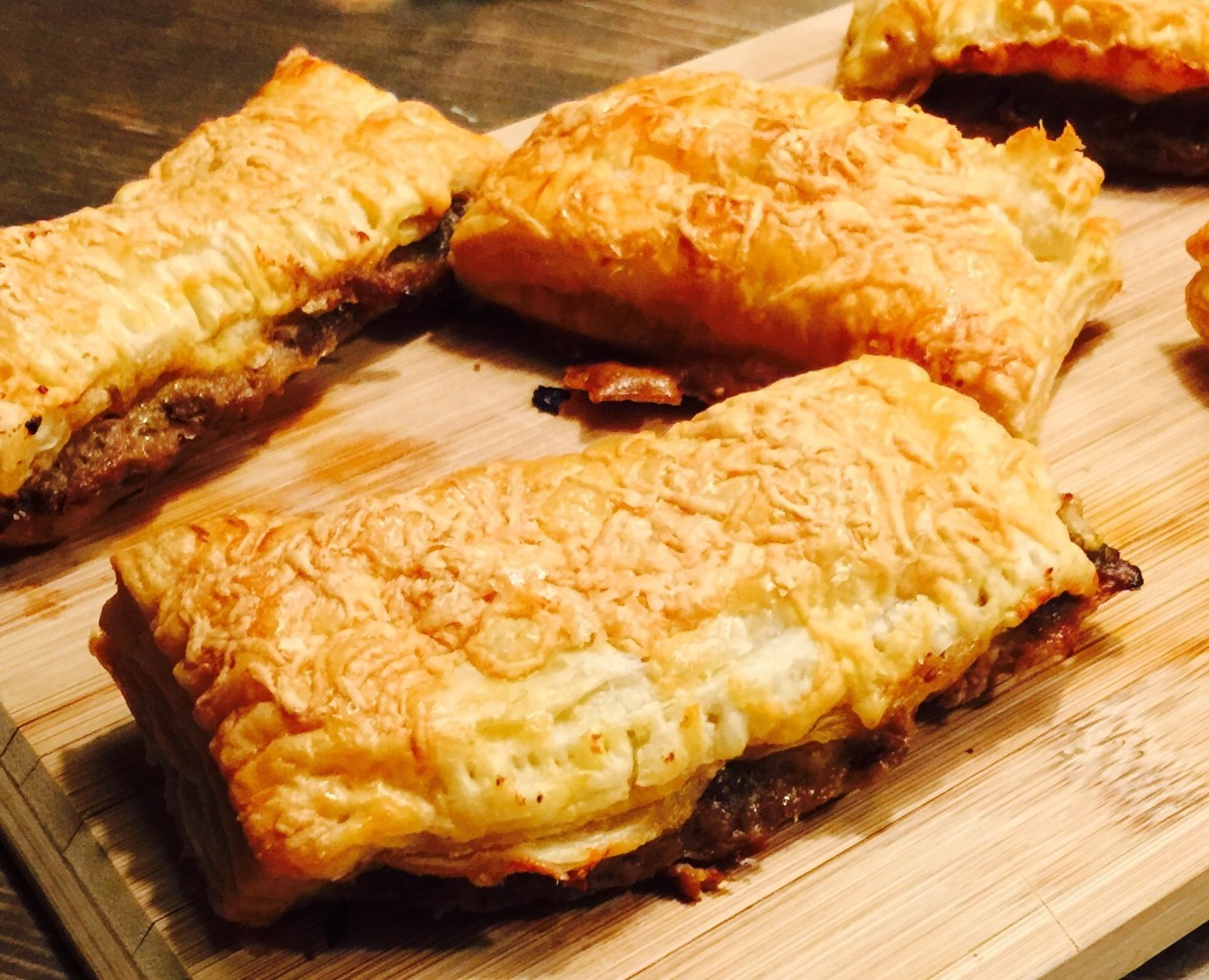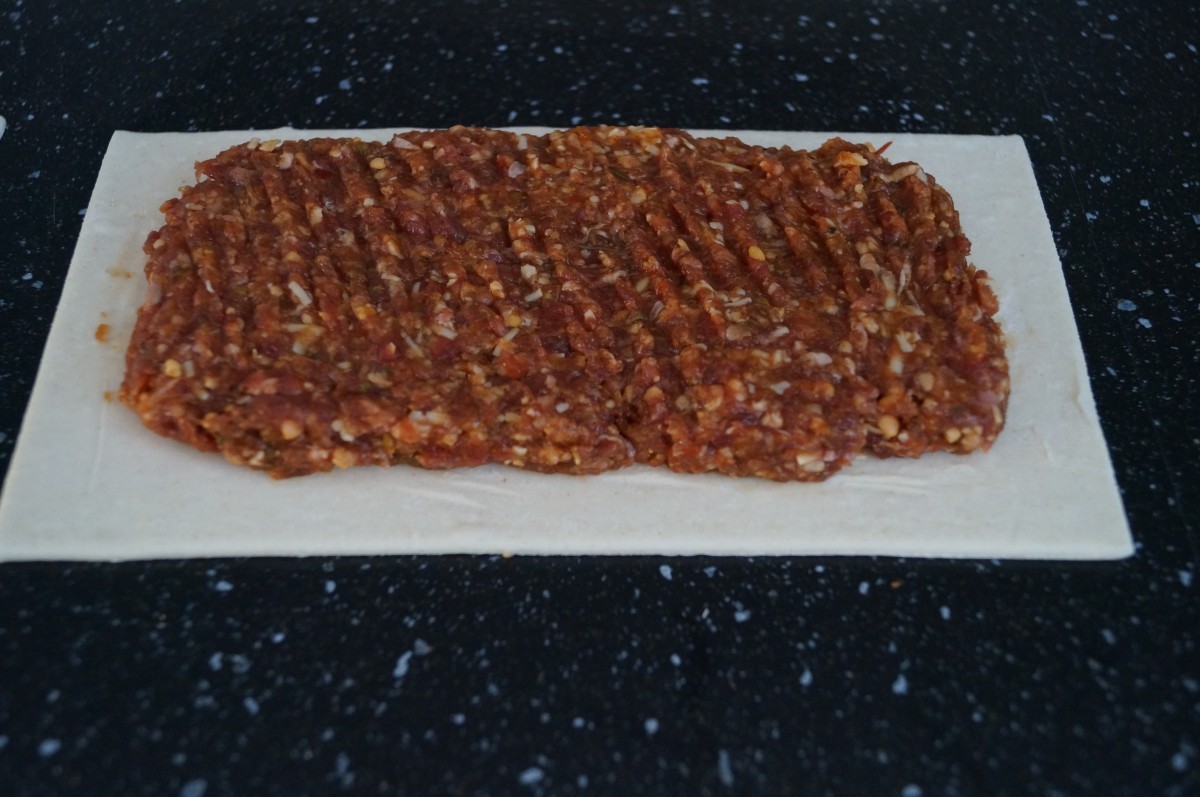 5. Verdeel het gehakt over 3 plakken bladerdeeg