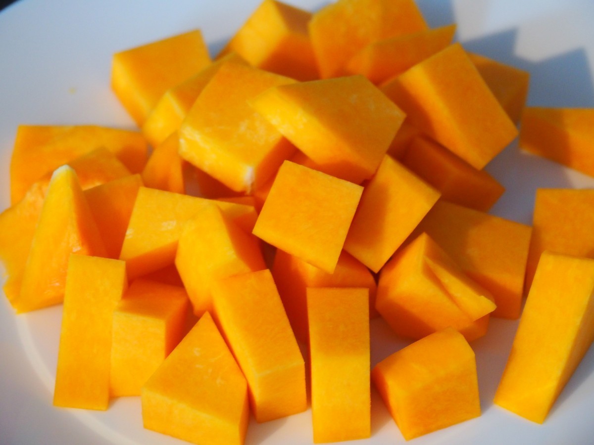 - Snijd de pompoen in kleine stukken, zonder schil en zaden