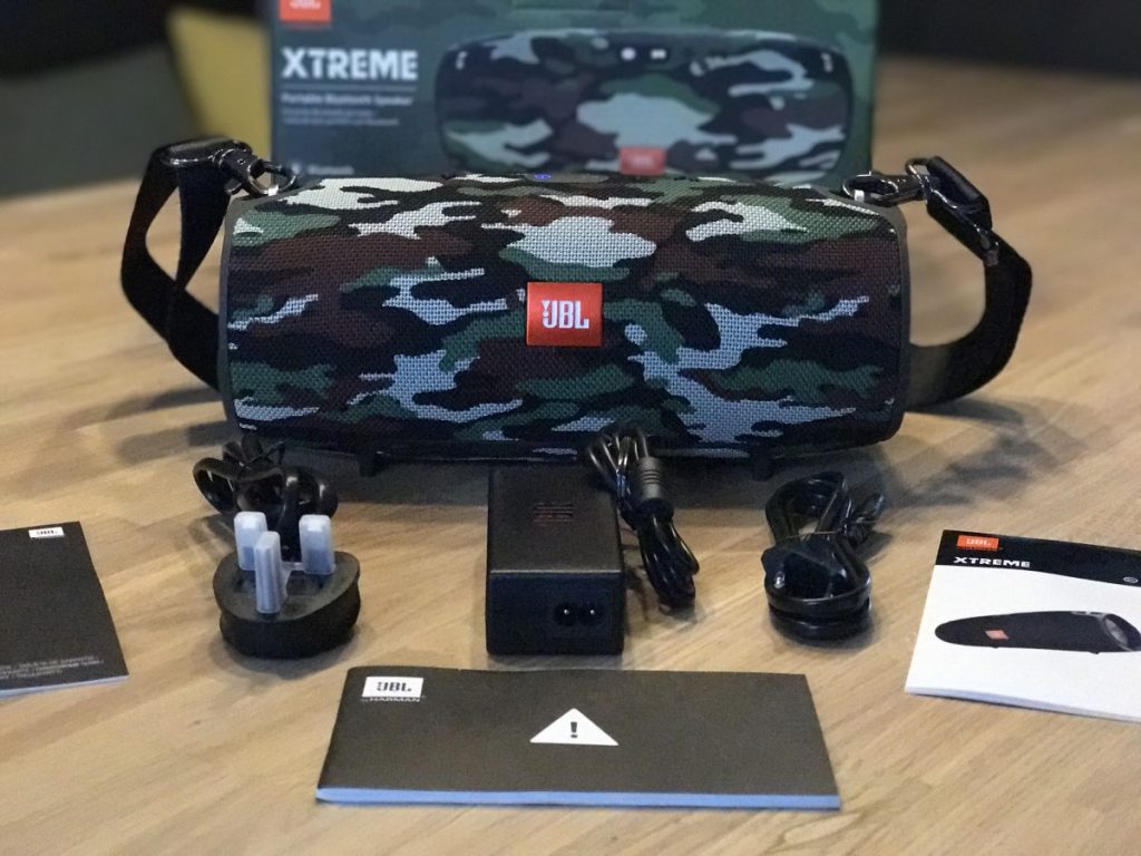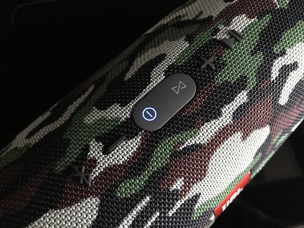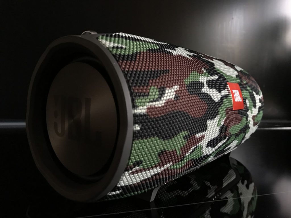 Deze luidspreker is qua styling de stoerste onder de draagbare boxen, niet alleen binnen JBl maar echt van alle boxen. Waar de JBL Flip 4 het moet hebben van zijn geluid, zal de JBL Xtreme al imponeren terwijl die uitstaat. Je zal bijna gaan denken dat ie het alleen maar van zijn looks zal moeten hebben. Over het geluid hebben we het zo, ik blijf nog even bij het uiterlijk. Ik heb gekozen voor de stoere uitstraling van de Special Edition met camo kleuren. De “normale” uitvoering is er in zwart, blauw en rood. Er zijn verder geen verschillen tussen de twee edities…zelfs niet in de prijs. De Xtreme is handzaam maar hij is wel een stuk groter en zwaarder dan bijvoorbeeld de Flip 4. Dit is geen enkel probleem voor mij, omdat je hiervoor wel heel veel meer box (lees geluid) terug krijgt. Het is wel belangrijk dat je eerst even goed nadenkt wat je met je luidspreker wilt gaan doen, voordat je een keuze maakt.