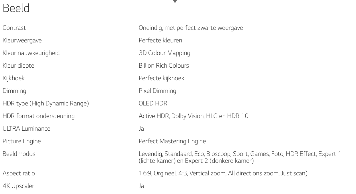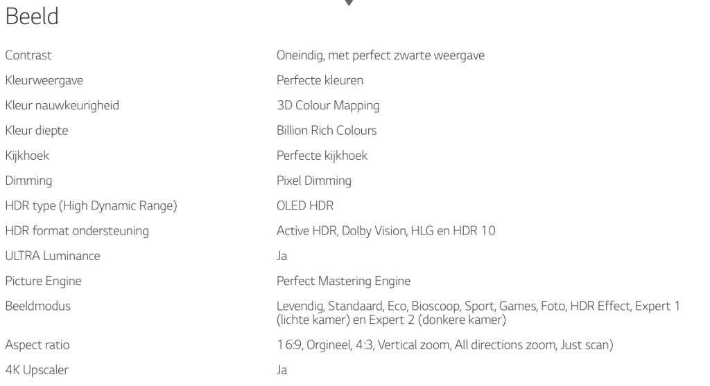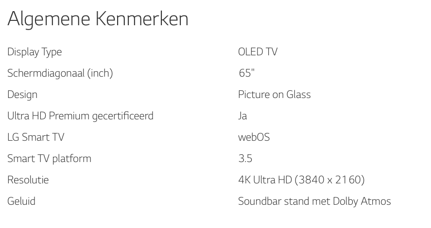 Ik zei net al iets over het geluid. Het geluid van de meeste televisies is er met het steeds dunner worden niet beter op geworden. Dit lijkt nu (gelukkig) weer belangrijker te worden. Het standaard geluid van de LG Oled 65 E7 TV is echt heel goed. Nu worden de beeldschermen steeds platter maar nu zie je wel dat er een grotere kast onder hangt voor het geluid. We zullen ergens moeten boeten voor een geweldig geluid. Ik vind het persoonlijk niet erg omdat ik liever een goed geluid heb. De standaard met de boxen is door de grote van de televisie bijna groter dan menig soundbar. Ik sluit mijn televisie alsnog wel aan op mijn hifi set. Het zou dus eigenlijk wel gaaf zijn als ze de box en het beeldscherm los zouden koppelen. Dan heb je de keus, ga je voor een super plat geïnstalleerde tv of ga je met de boxen voor een goed geluid van de televisie.