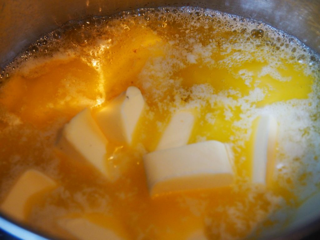 2. Smelt boter in een pan en voeg de gehakte chocolade toe