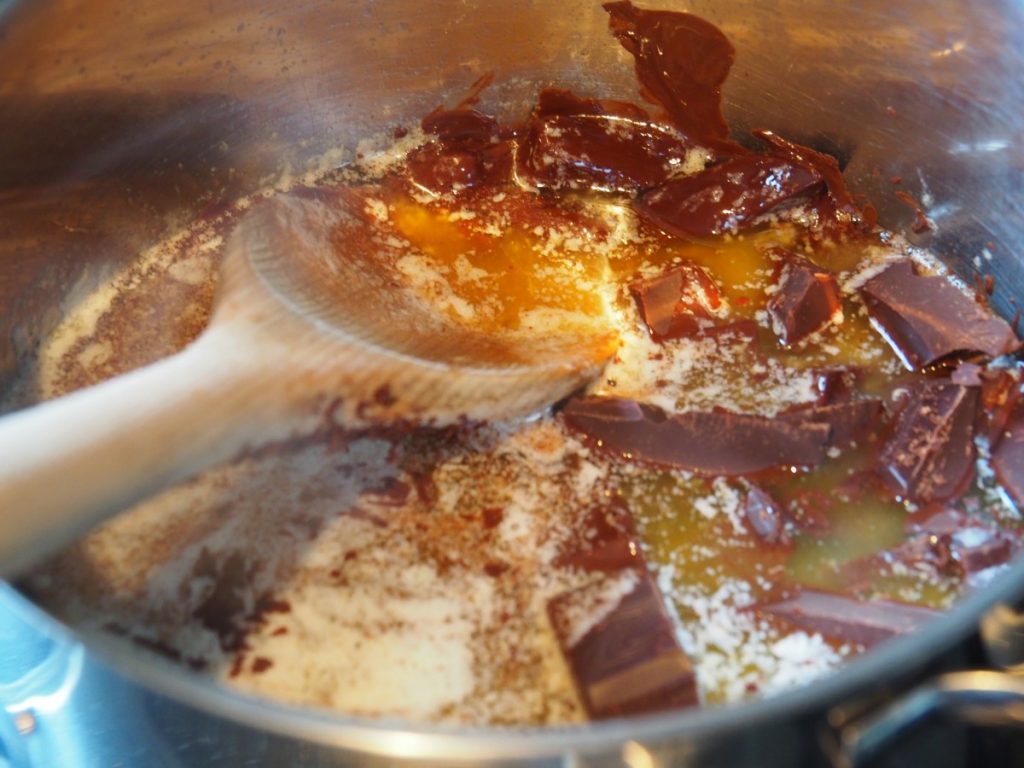 3. Roer alles goed door elkaar met een houten lepel tot de chocolade gesmolten is