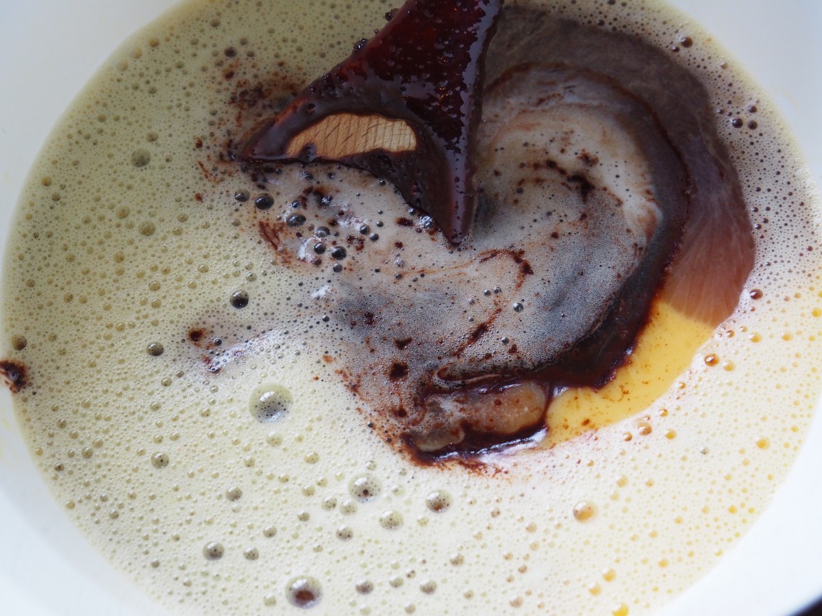 9. Haal het vanillestokje uit het chocolademengsel en roer het mengsel en de Guinness door de eieren