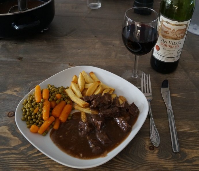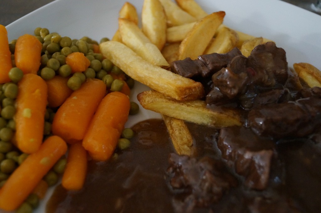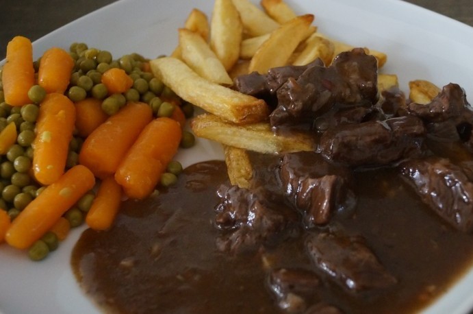 De temperaturen zijn nog niet echt herfstachtig, maar deze stoofpot is zoooo lekker, dat het niet uitmaakt dat het nog steeds 20 graden is. Het voordeel van stoofvlees is dat je het naar smaak kunt aanpassen en met alles kan eten wat je lekker vindt. Wij hebben het gegeten met hoe kan het ook anders???….zelfgemaakte patat, met worteltjes en doperwtjes. Een dag later heb ik het gegeten met 2 lekkere zuurdesem boterhammen(ook onwijs lekker). Voor stoofvlees geldt hoe langer stoven hoe beter, ik heb hem ruim 4,5 lekker laten sudderen en het vlees was daardoor botermals geworden. Nu ik het zo opschrijf krijg ik meteen weer trek hahaha.