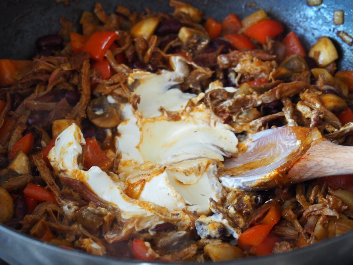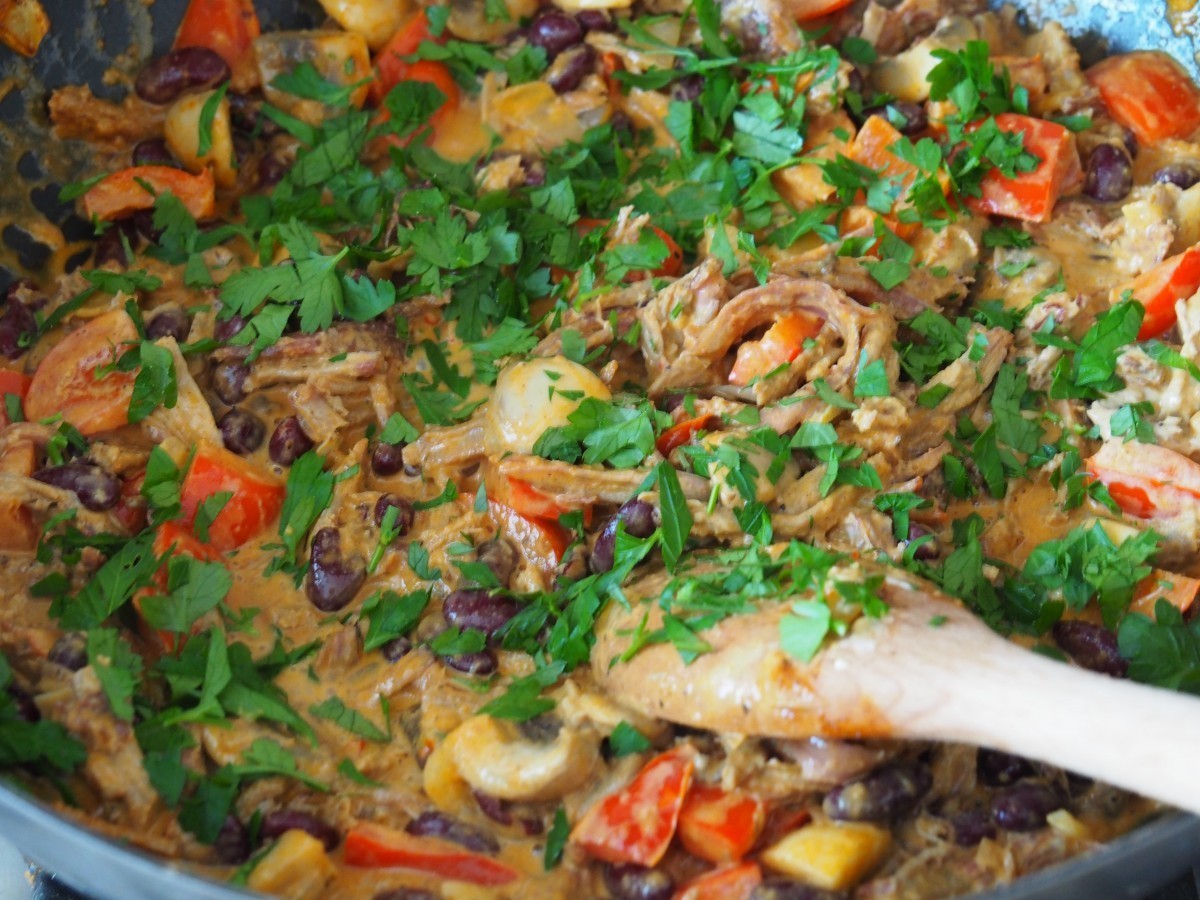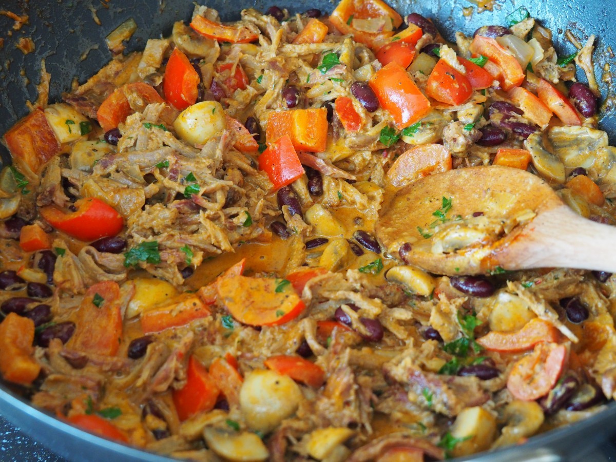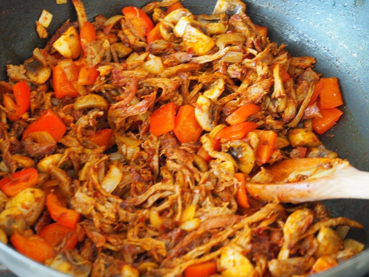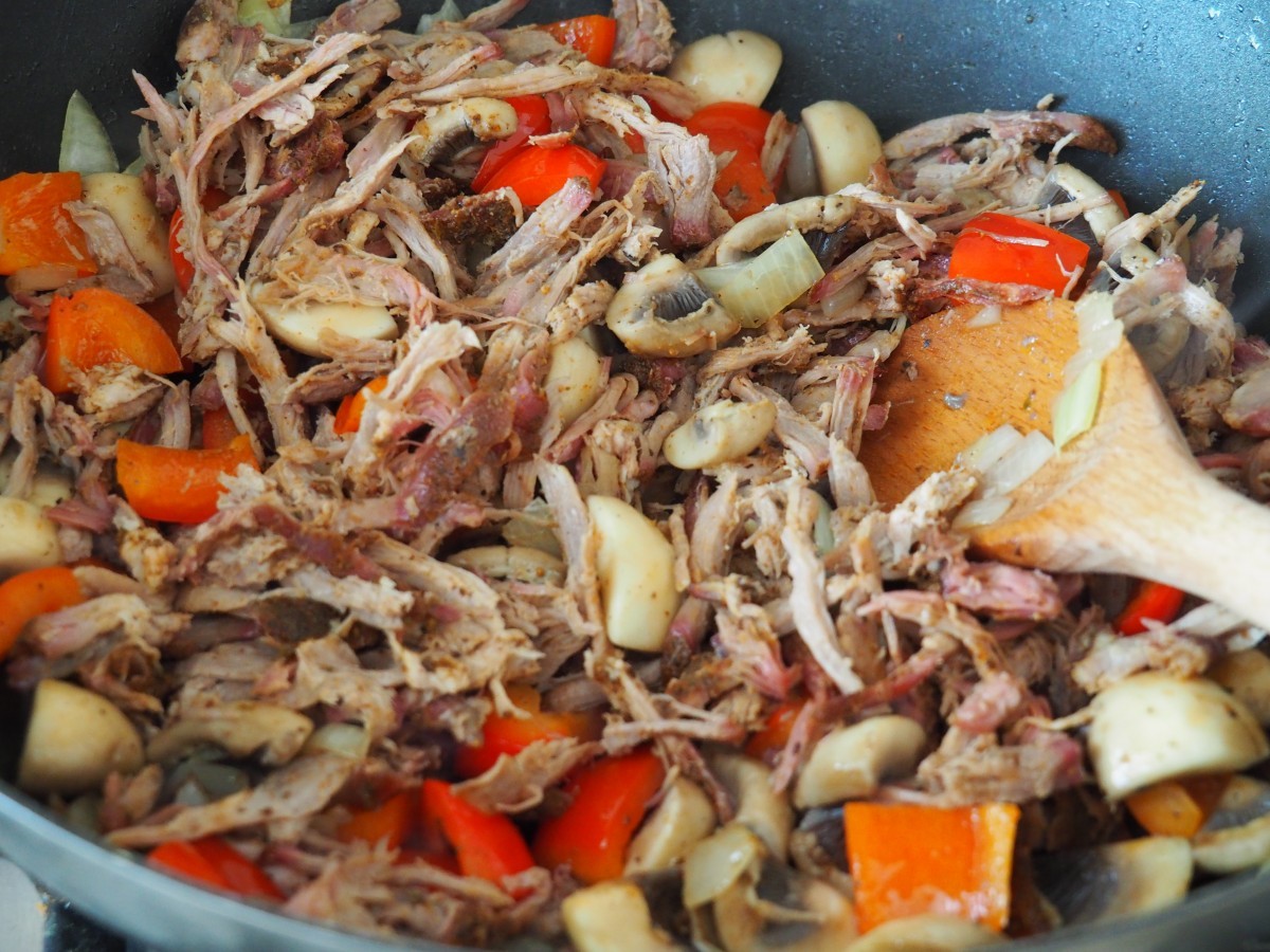 - Voeg de pulled pork toe en meng alles goed doorelkaar