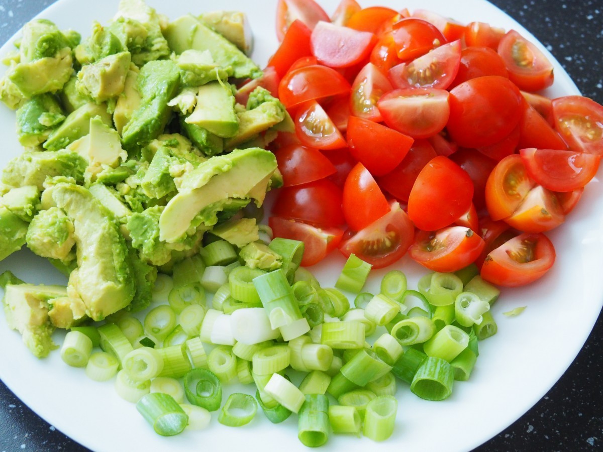 - Garneer de taco’s met de gesneden bosuitjes, avocado en tomaatjes