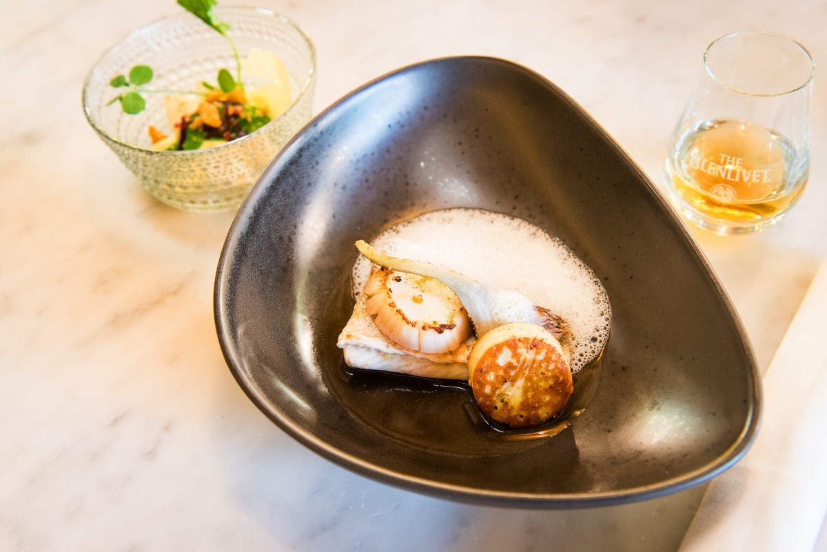 Na deze heerlijke cocktail werd het tijd om de gerechten te gaan proeven die François had gemaakt op basis van de smaken en aroma’s die in The Glenlivet F.R. zijn waar te nemen. Dit was oprecht kennis maken met het kook-kunstenaarschap van François. Het is allemaal niet te beschrijven wat er in dit 6-gangenmenu op tafel werd gezet, maar het was bijna ongelooflijk hoe mooi deze food pairing in elkaar was gestoken. Ik heb mij ook diverse keren in de arm moeten knijpen om te weten dat ik niet aan het dromen was. Ik zal toch een paar voorbeelden geven van deze geweldige combinaties. Hou je vast en droom mee;