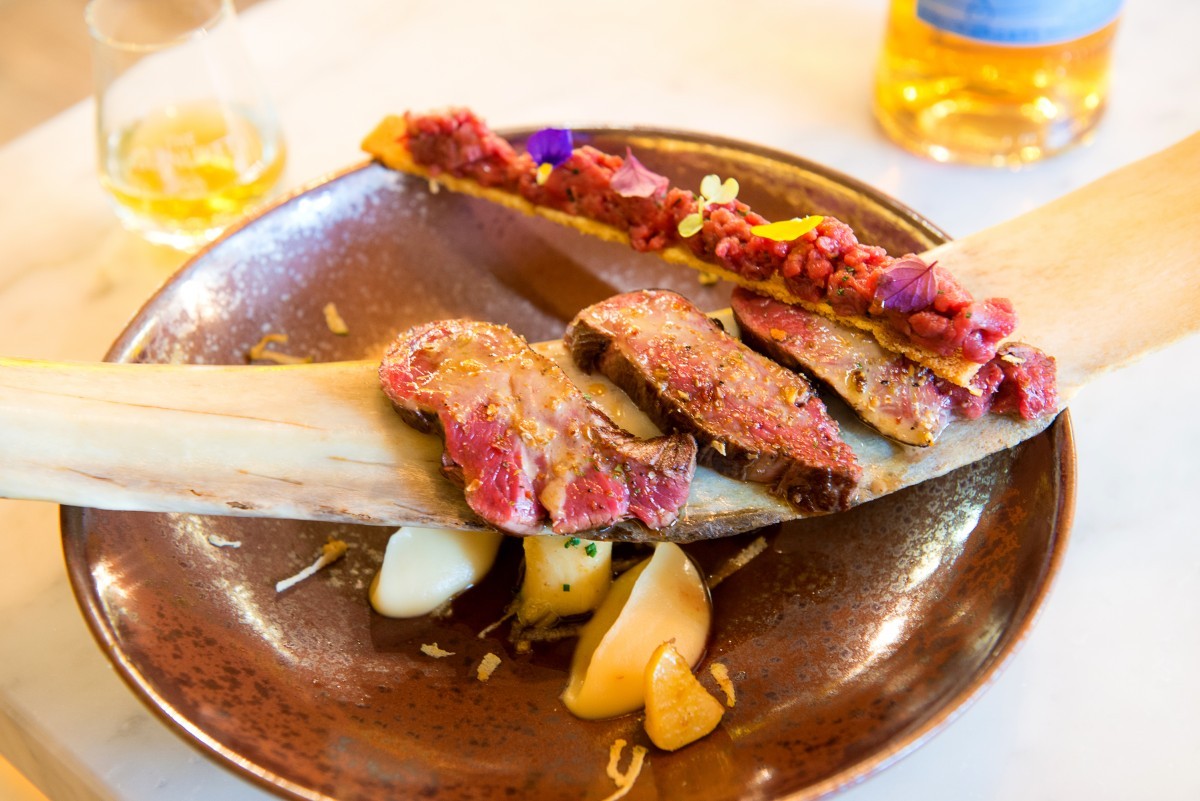 Beef / patisson / paddenstoel / crumble van broodcroutons gekaramelliseerd in muscovado / steak tartare / crème van pastinaak / gember / kombu / jus van whisky.