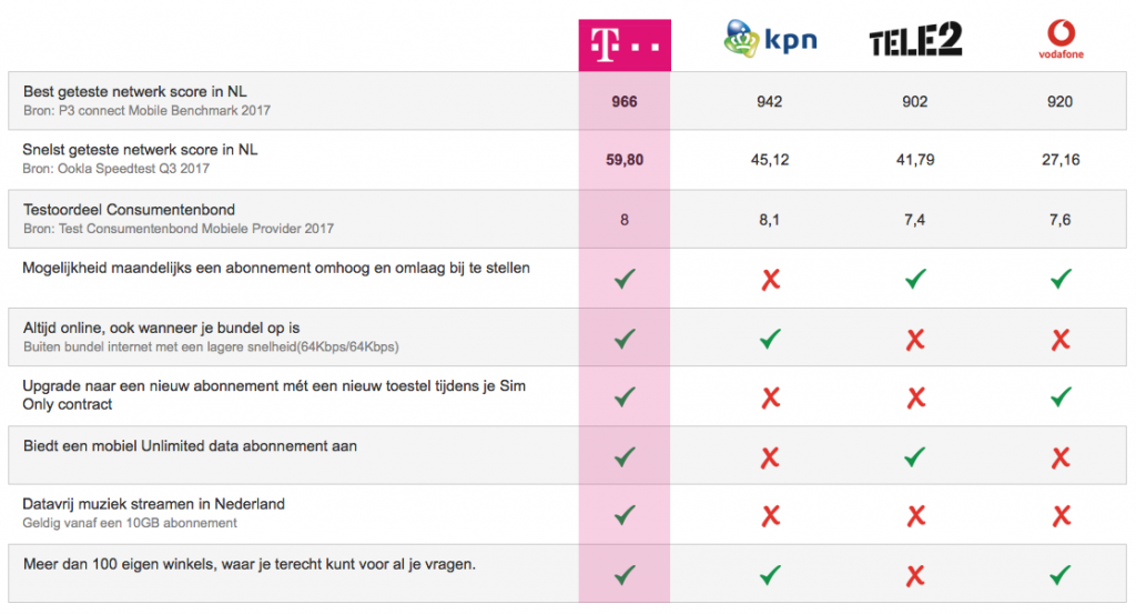 T-Mobile heeft een ijzersterk netwerk, ze zijn als beste getest en komen ook op snelheid als winnaar uit de bus. Zelfs bij de consumentenbond komen zij als één van de beste uit de bus. Het voordeel van het Sim Only abonnement is voor mij de vrijheid. Je kan je abonnement maandelijks omhoog en omlaag bijstellen. Gaat je telefoon kapot of wil je na een tijdje wel een nieuw toestel, dan zetten ze je huidige abonnement gewoon om naar een nieuwe. Uiteraard wel met de voordelige tarieven! Dit soort dingen vind ik echt wel een heel groot pluspunt. Iets wat ik ook een voordeel vind is dat je kan kiezen voor een onbeperkt data abonnement. Zo kom je echt nooit meer voor verrassingen te staan en heeft mijn dochter geen excuus meer als ze mij niet terug appt 😉