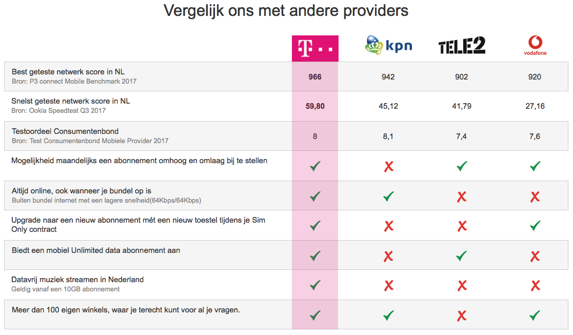 T-Mobile heeft een ijzersterk netwerk, ze zijn als beste getest en komen ook op snelheid als winnaar uit de bus. Zelfs bij de consumentenbond komen zij als één van de beste uit de bus. Het voordeel van het Sim Only abonnement is voor mij de vrijheid. Je kan je abonnement maandelijks omhoog en omlaag bijstellen. Gaat je telefoon kapot of wil je na een tijdje wel een nieuw toestel, dan zetten ze je huidige abonnement gewoon om naar een nieuwe. Uiteraard wel met de voordelige tarieven! Dit soort dingen vind ik echt wel een heel groot pluspunt. Iets wat ik ook een voordeel vind is dat je kan kiezen voor een onbeperkt data abonnement. Zo kom je echt nooit meer voor verrassingen te staan en heeft mijn dochter geen excuus meer als ze mij niet terug appt 😉