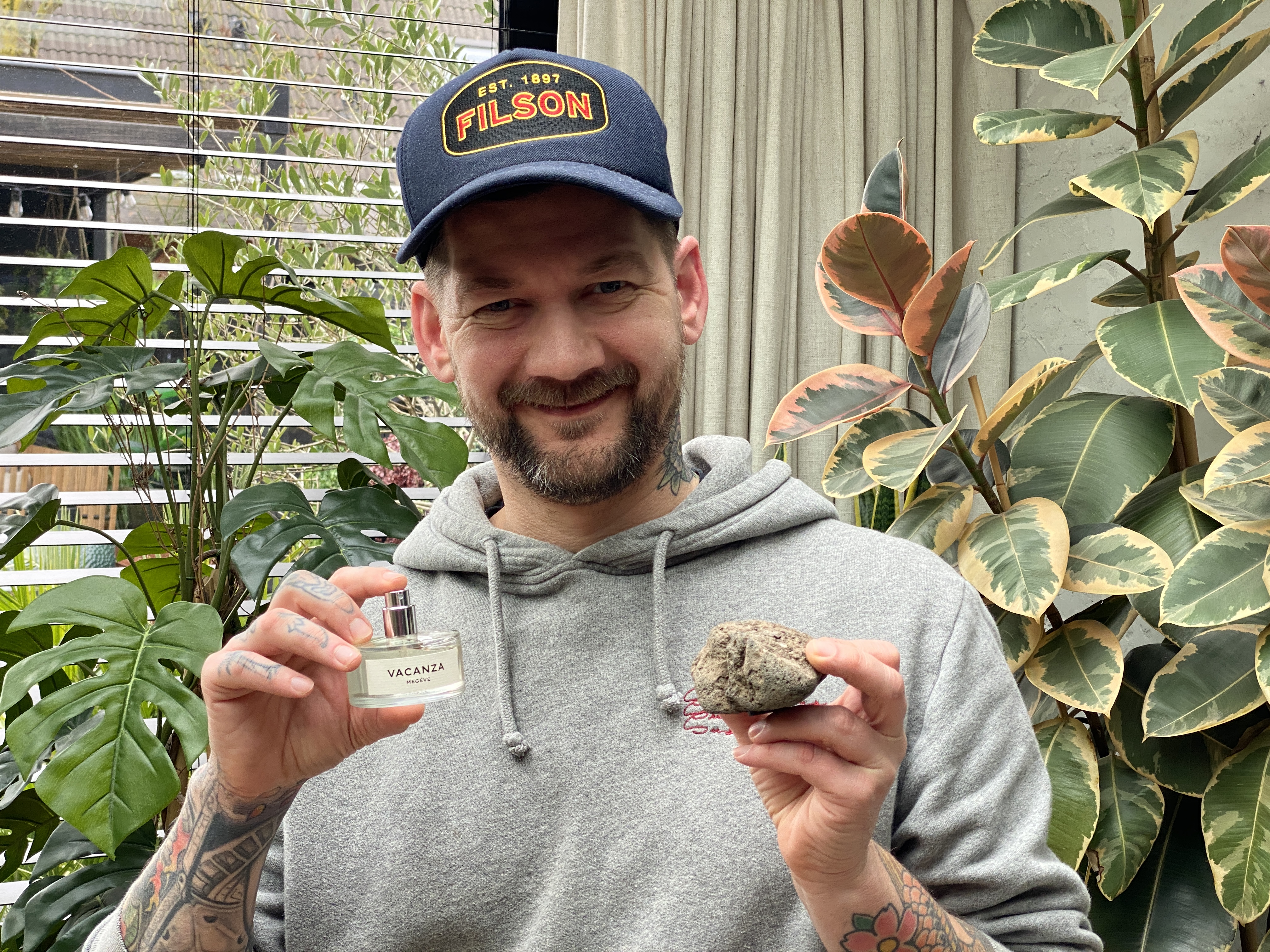 Jan Willem met de flacon van de VACANZA Megéve in zijn hand.