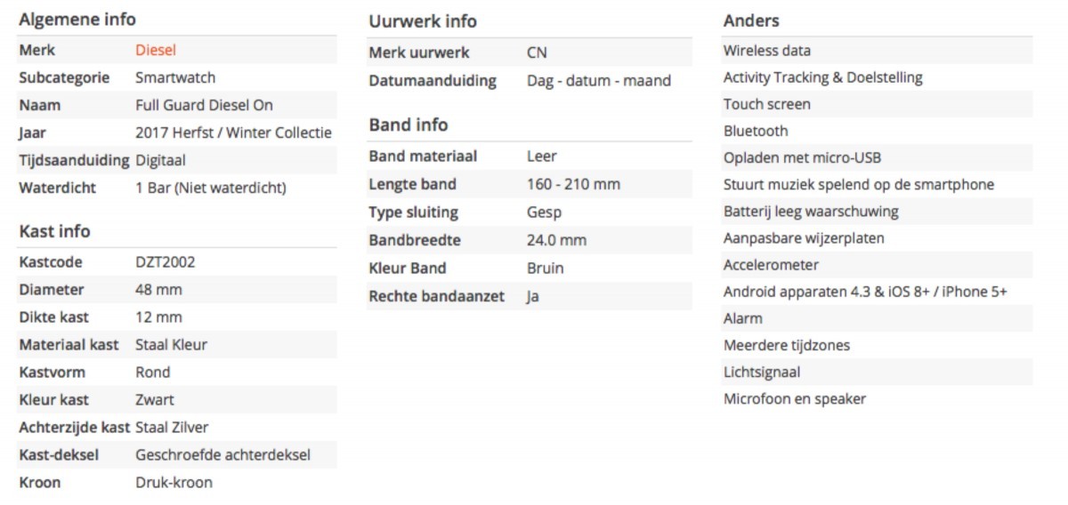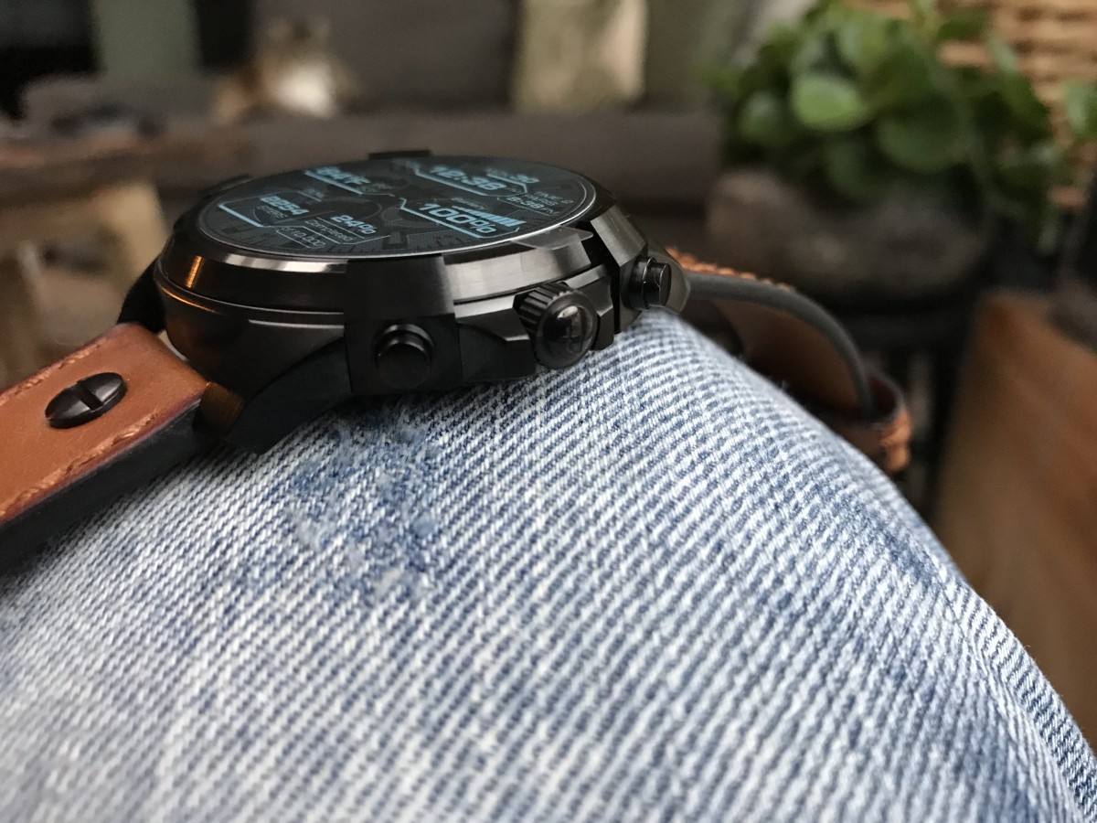 Super stoer, dat is eigenlijk het eerste wat mij direct opvalt. Alles is stoer! De verpakking waar het horloge in zit is al echt een tof item op zichzelf. Vervolgens heb je het horloge zelf, een stoere band gemaakt van Genuine Leather. Het leer is van een dikke en mooie kwaliteit. Stoere stiksels en popnagels maken het helemaal af. Ik vind de afwerking en zorg die besteed is aan het uiterlijk echt heel tof! Het horloge is niet alleen super stoer maar ook zeer multifunctioneel. De Diesel ON Smartwatch is te koppelen met Android OS 4.3 of IOS 9 en hoger. Hij kan je stappen tellen en houd je calorieverbranding bij. Verder kan je via je horloge je telefoongesprekken voeren, aannemen en ophangen. Super handig is dat je alle berichtjes of appjes ziet binnenkomen en je kan via het touchscreen een kort berichtje terugsturen. De band is verwisselbaar maar door de combinatie van bruin en zwart past hij juist bij iedere outfit. Hij is spatwaterdicht dus ook een regenbuitje kan hij prima hebben.